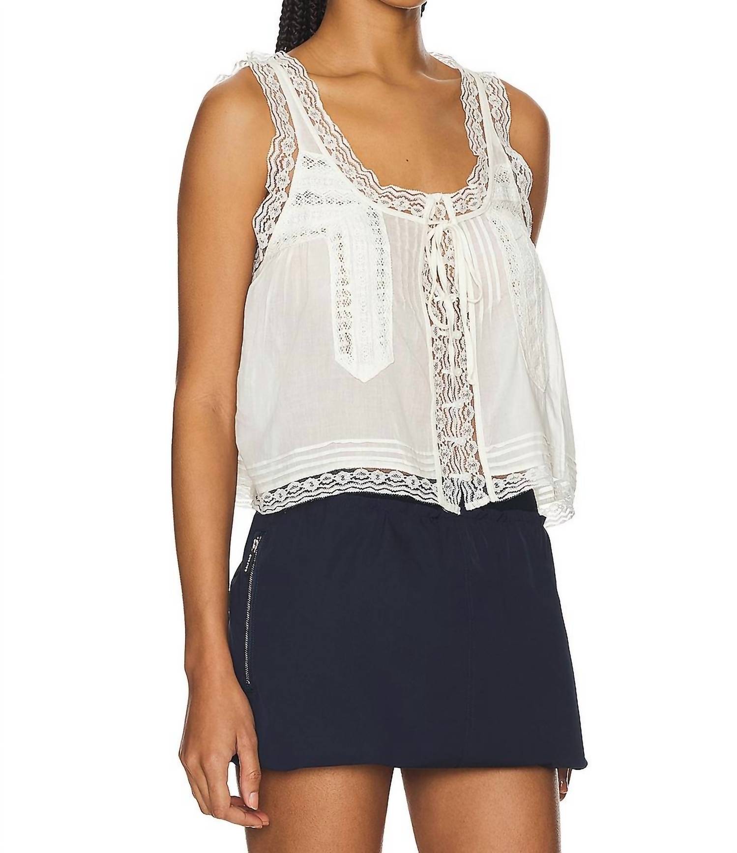 100% algodão. Fabricado na Índia. Lavável à máquina. Caimento relaxado, levemente cropped. Tecido macio, decote redondo, silhueta sem mangas, acabamento com babados, detalhes em renda transparente, amarração central ajustável na frente.