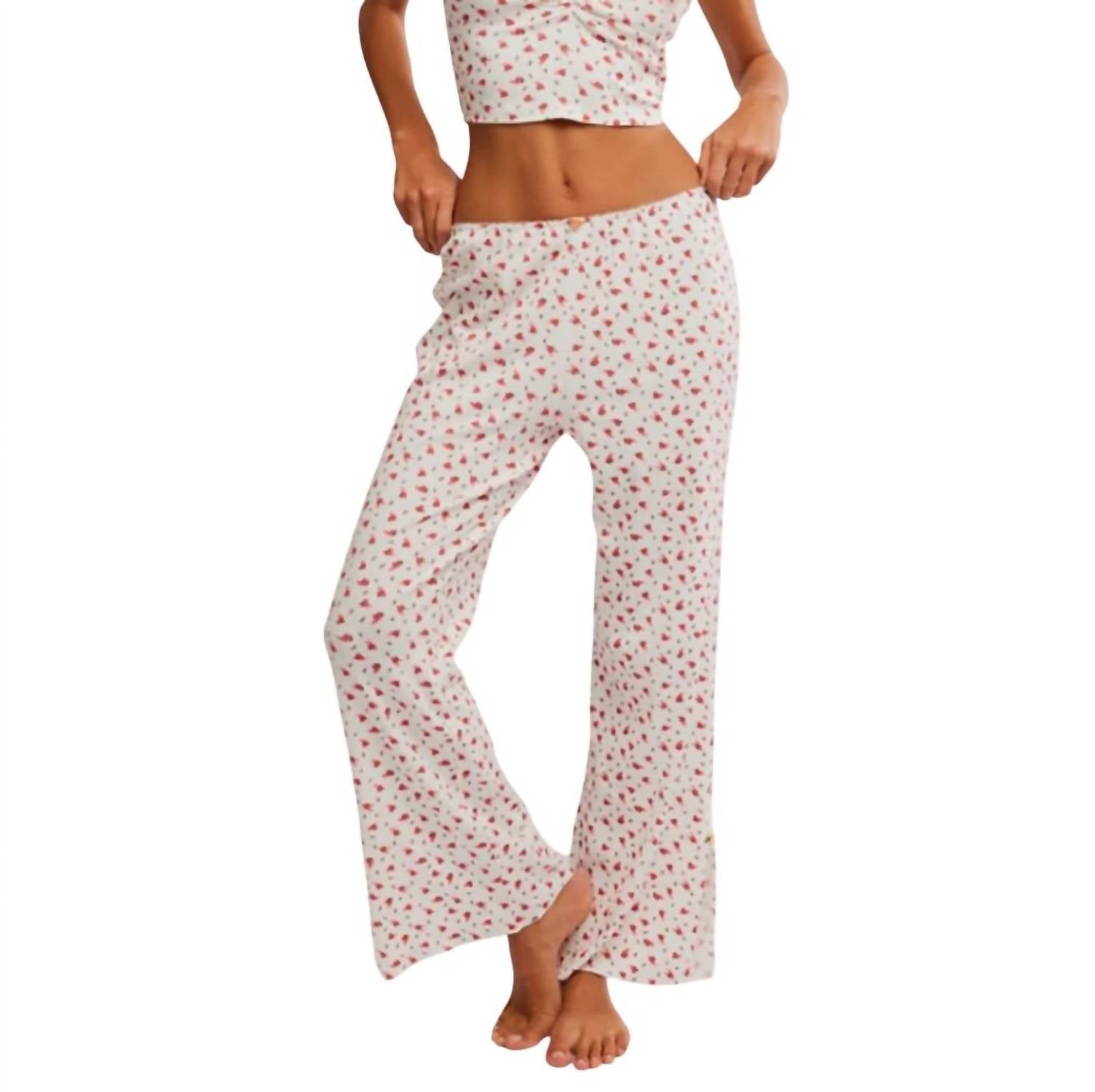 Features: Top: Sweetheart neckline, ruched seam at the bust, rosette applique, floral pointelle knit; Pants: Pull-on design, picot trimming at the waistband, vented hemline, coordinating fabrication