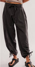 Introducing the Hadley Poplin Trousers by Free People, perfect for spring athleisure looks and concert-ready style. These mid-rise trousers feature a relaxed parachute fit with a tapered leg that cinches at the hems. Crafted from a 65% Cotton, 35% Rayon blend, they offer a comfortable wear with a pull-on design and tie closure. With practical side pockets and easy machine wash care, these solid black trousers are a functional and fashionable addition to your wardrobe. Dimensions: 14.5" rise and 27" inseam.