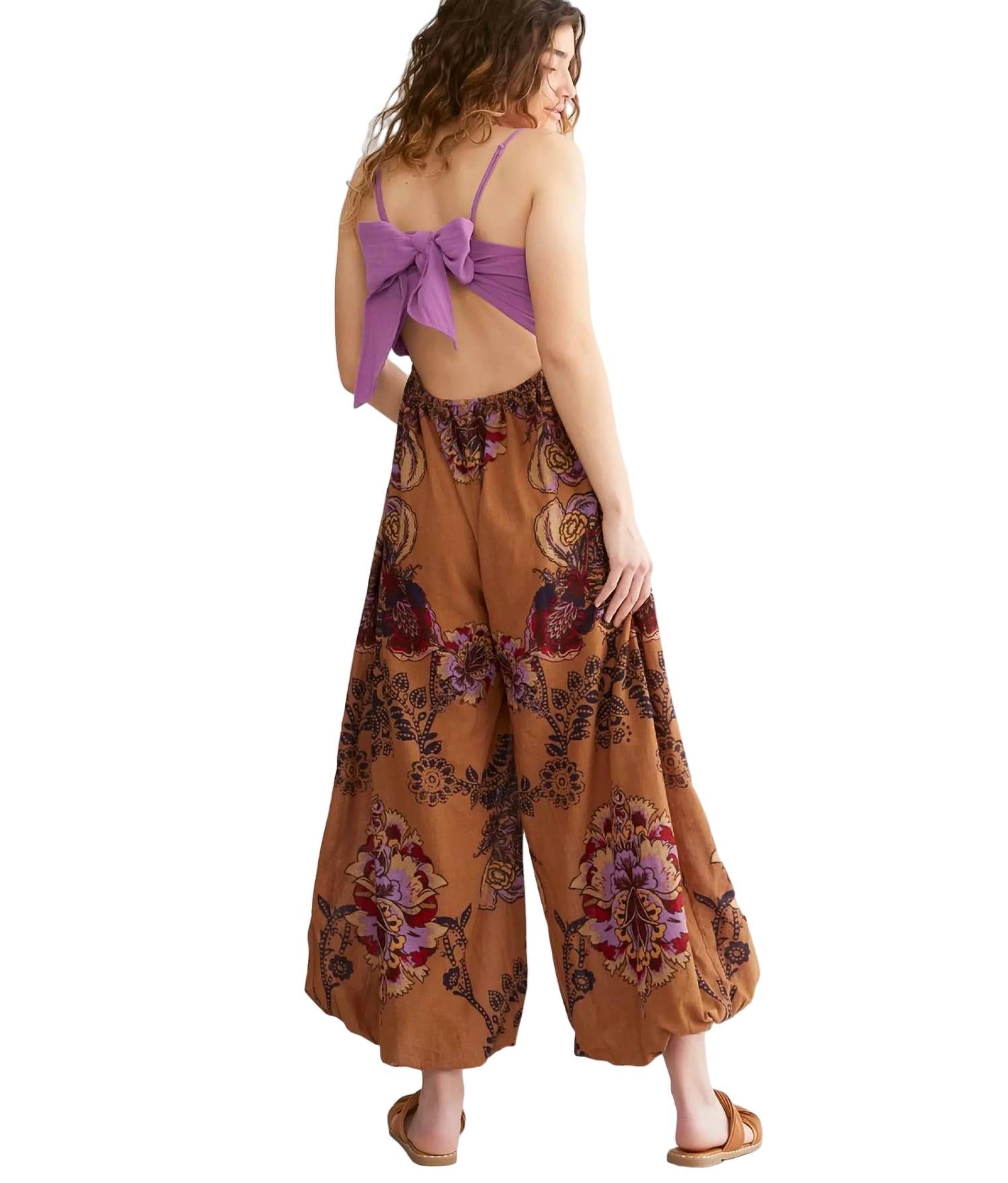 Macacão forrado com estampa floral e bordado. Detalhe de amarração nas costas. Cós elástico. Alças removíveis. 68 cm de comprimento interno. 71 cm de busto no tamanho pequeno. Comprimento do corpo até 142 cm no tamanho pequeno. Lavagem à máquina com água fria. 100% algodão. Forro 100% viscose.