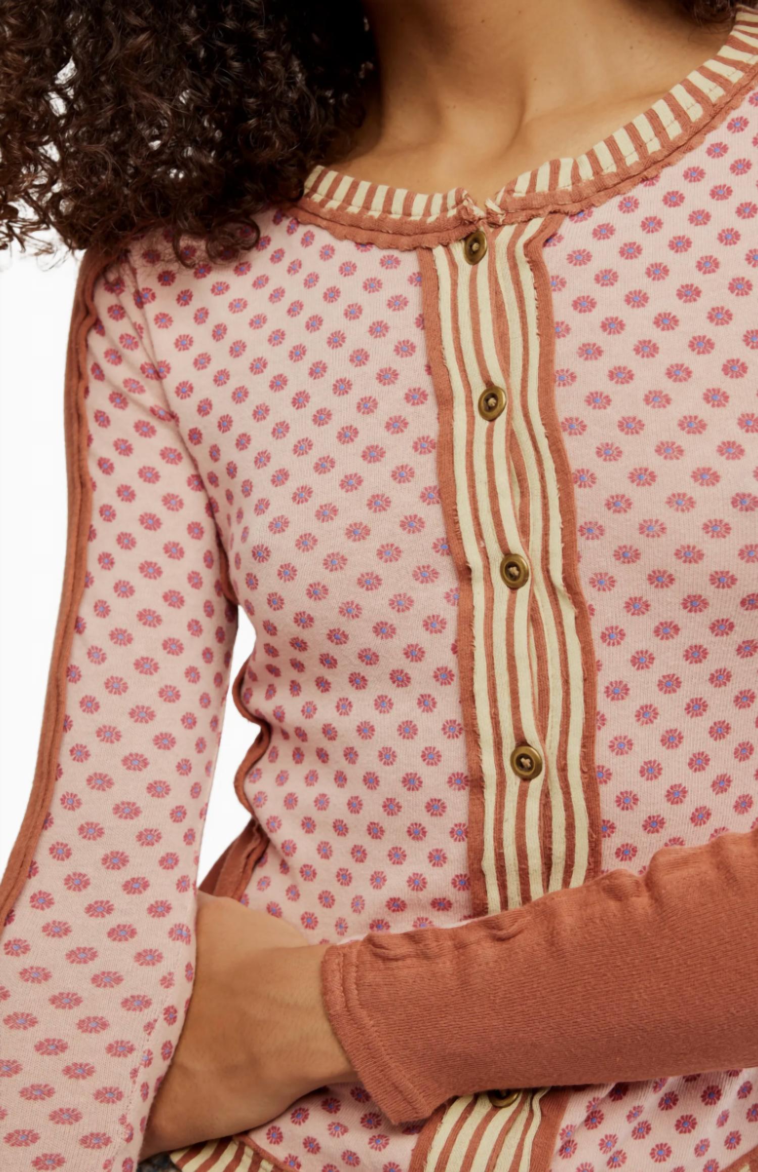 A camiseta de manga comprida perfeita que combina com quase tudo. Apresentamos a camiseta de manga comprida Instant Classic da Free People, uma peça essencial para qualquer guarda-roupa com seu padrão floral exclusivo em um tom rosa. Esta camiseta possui mangas compridas e é confeccionada em algodão macio, garantindo um caimento justo e confortável, com decote redondo. Com fecho frontal por botões e detalhes de costura sem acabamento, é perfeita para usar em camadas durante todas as estações. As instruções de cuidado incluem lavagem à máquina com água fria para facilitar a manutenção.