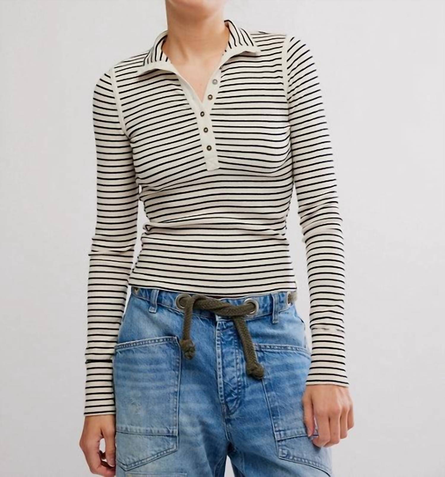 Discover the Lake Henley Stripe Tee by Free People, a chic addition to your spring wardrobe perfect for holiday parties. Crafted from a stretchy, ribbed cotton blend composed of 95% cotton and 5% elastane, this long-sleeve tee features a fitted silhouette with a henley neckline and a funnel collar. With a length of 21.5 inches and a 29-inch bust for size small, it's as stylish as it is comfortable. Closure: Button closure. Care: Machine wash cold. Color: Tea Combo.