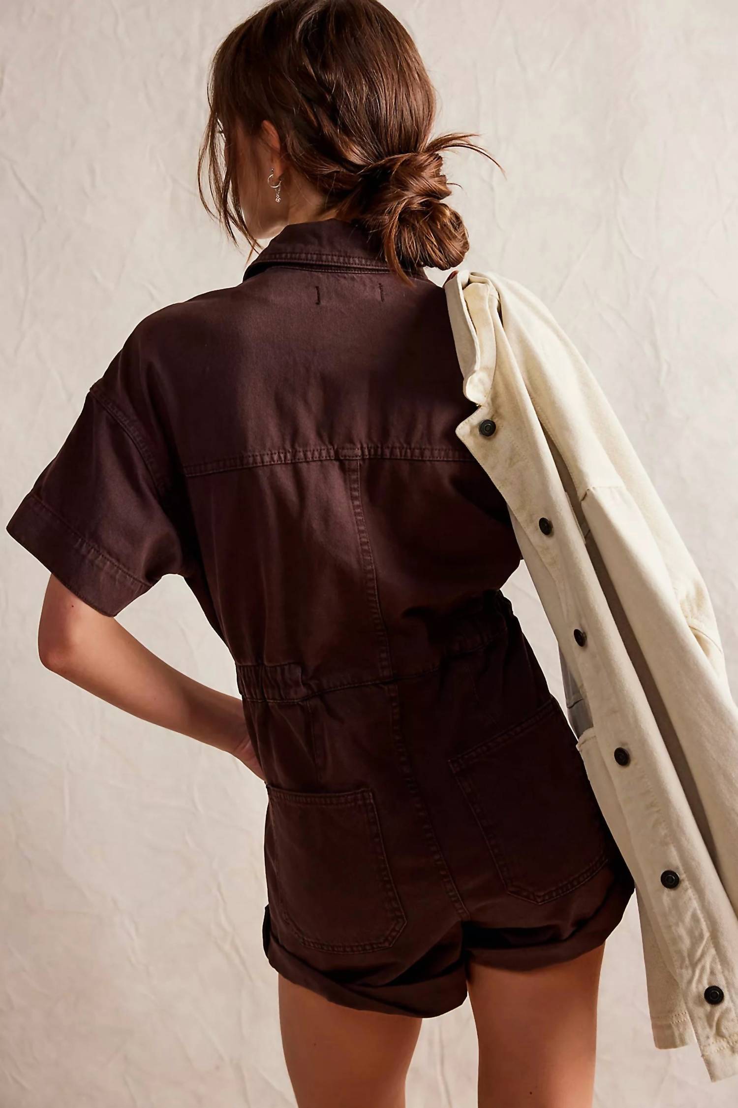 Discover the Marci Button Front Cuffed Shortall Romper by Free People, an essential from the We The Free collection perfect for effortless summer style. This piece has a comfortable sleeve length of 6.5 inches, made from 100% durable cotton in a rich mocha brown solid pattern. Designed in a relaxed, button-up silhouette, it features button closures with workwear-inspired pockets for added functionality. Care instructions include machine wash cold and line dry, ensuring ease and longevity in your wardrobe. Measurements for size small: Bust 44", Waist 32", Hips 42", Rise 12.75", Inseam 3.25".