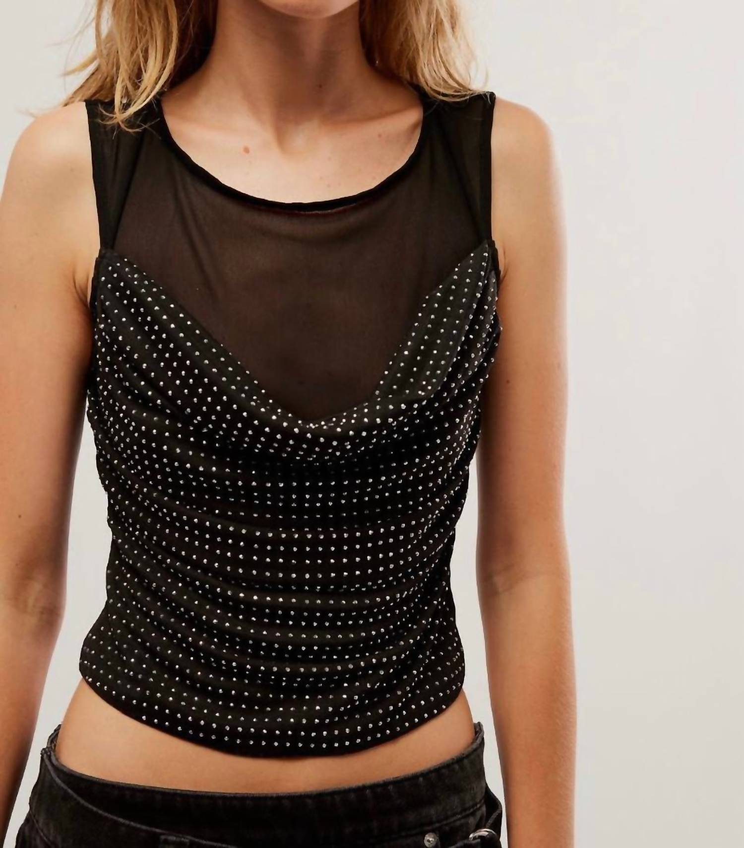 Modelagem ajustada. Corte levemente cropped. Decote canoa. Acabamento em mesh transparente. Franzido no corpete. Detalhe de decote em V na parte de trás do pescoço. Lavagem à mão com água fria. 100% poliéster.