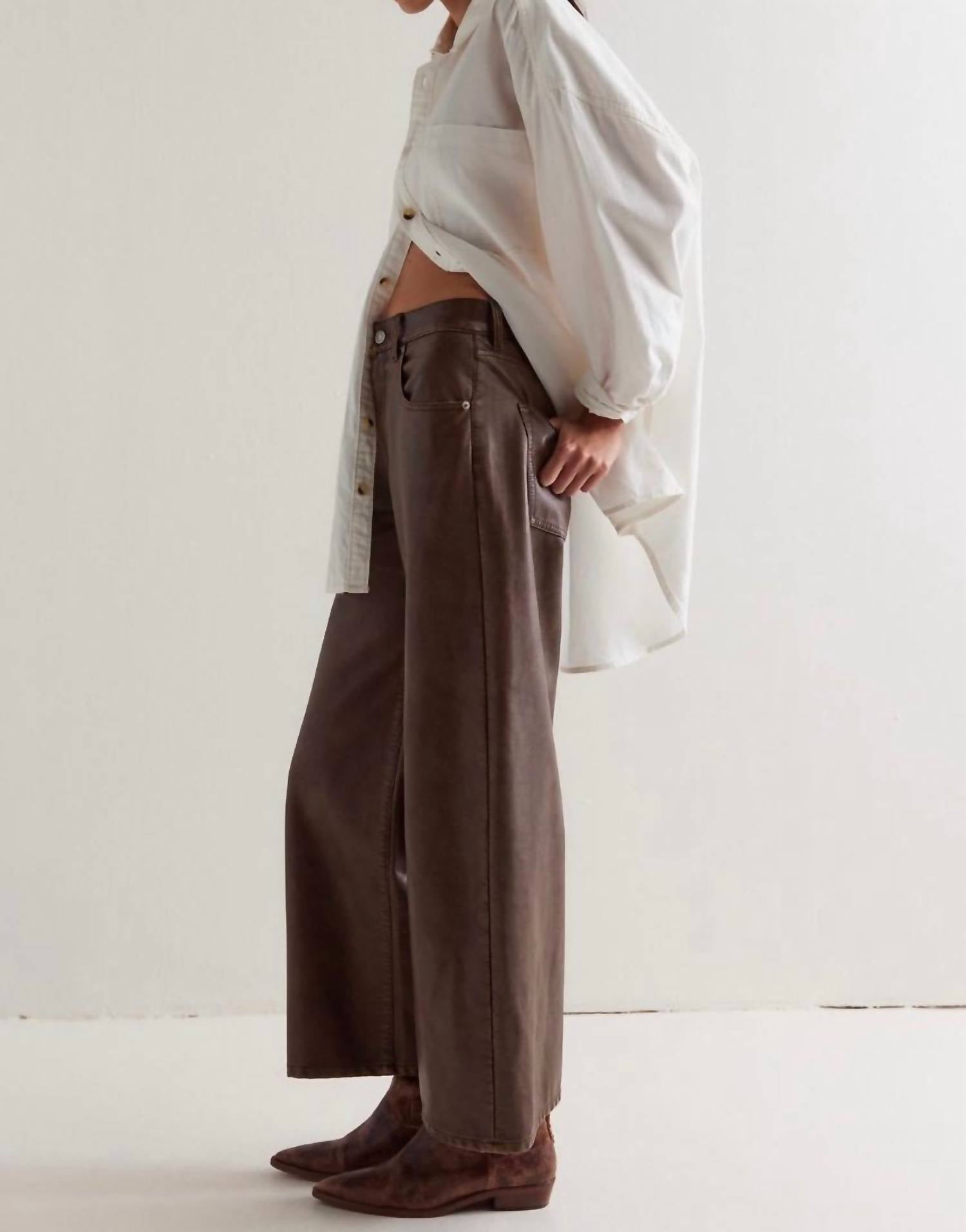 Discover the Misha Vegan Pants by Free People, the ultimate statement piece for your wardrobe. These wide-leg pants in rich brown feature a mid-rise, loose barrel silhouette crafted from 100% viscose with a polyurethane coating for a leather-like look. Designed with practicality in mind, they include a zip-fly and button closure, along with five-pocket styling and subtly tapered legs. Made in China, these pants are easy to care for with machine wash instructions, making them a chic and convenient choice for the season.