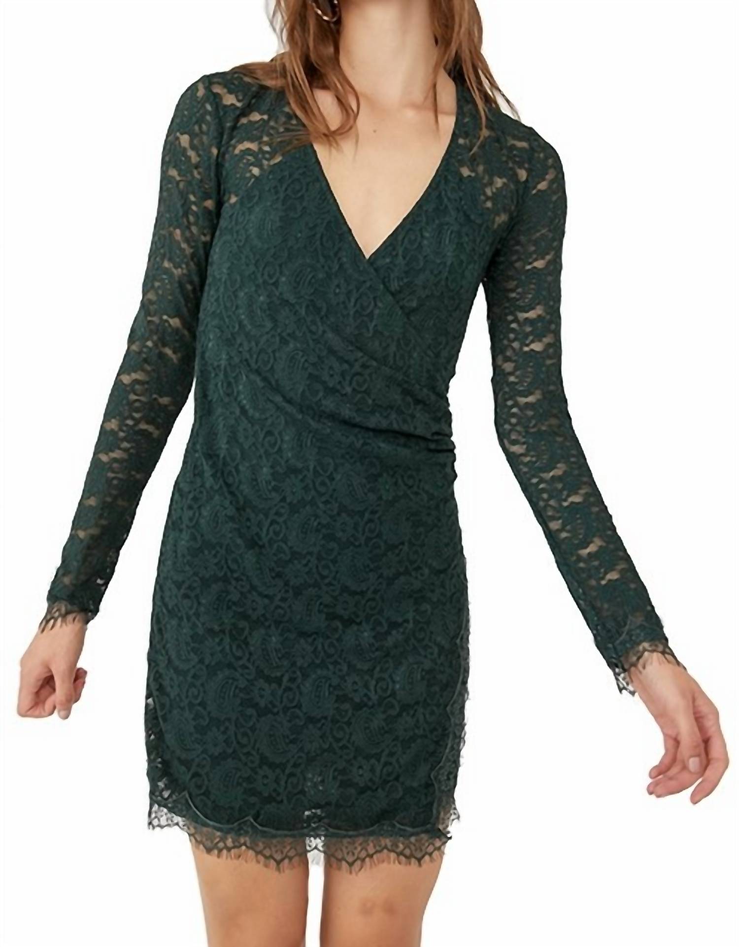 Decote em V, mangas compridas, saia envelope justa e silhueta marcada, finalizada com renda com acabamento recortado nos punhos e na bainha. Este vestido é forrado e fácil de vestir.