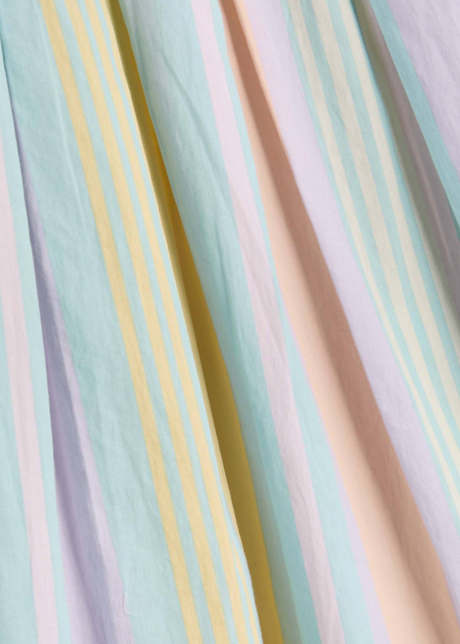 The Primavera Stripe Midi Dress by Free People offers a fresh pastel combo for a streetwear-inspired look. This sleeveless dress features a square neck and charming tie-fastening details at the shoulder straps. Designed with inverted pleats at the waist and practical side slip pockets, it ensures both style and functionality. Comprised of 100% cotton, it has a relaxed fit and is secured with button fastenings at the front. Length from shoulder to hem is 44 inches (111.5cm), and it's machine washable for easy care.