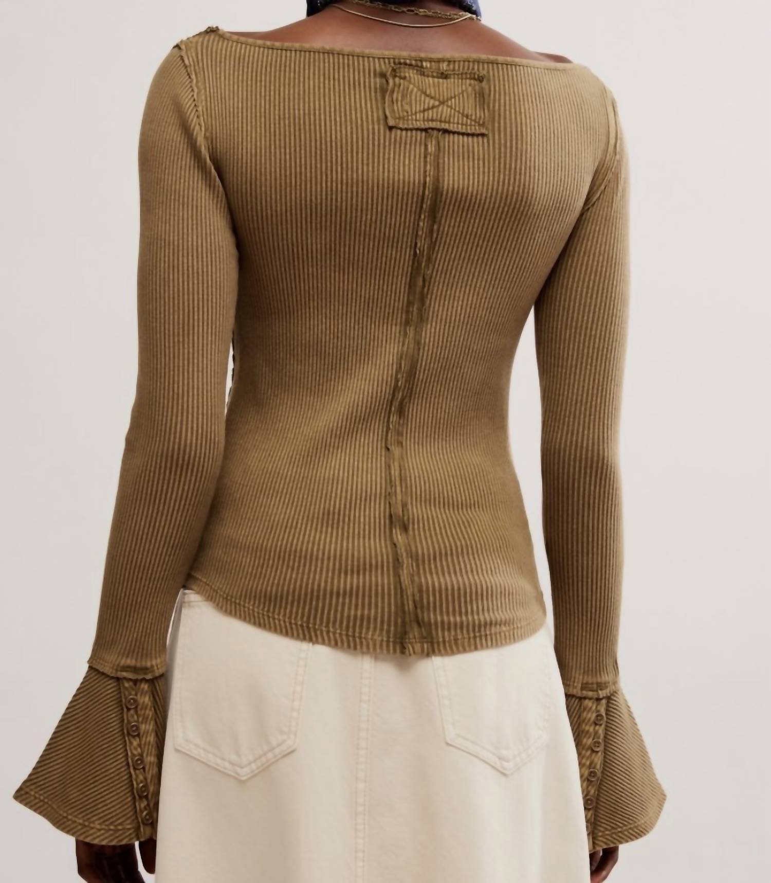 Uma blusa de manga comprida que você pode usar com jeans, saias, bem... quase tudo! Descubra a blusa Soul Sistering da Free People, uma adição estilosa ao seu guarda-roupa em tom oliva militar. Esta blusa possui mangas compridas com elegantes punhos sino, confeccionada em malha canelada que proporciona um caimento perfeito. Confeccionada em malha mescla de algodão e elastano, possui gola careca com detalhes de costura aparente e mede aproximadamente 57 cm de comprimento. Fechamento: Puxe para vestir. Cuidados: Lavar à máquina com água fria e secar na horizontal. Importado.