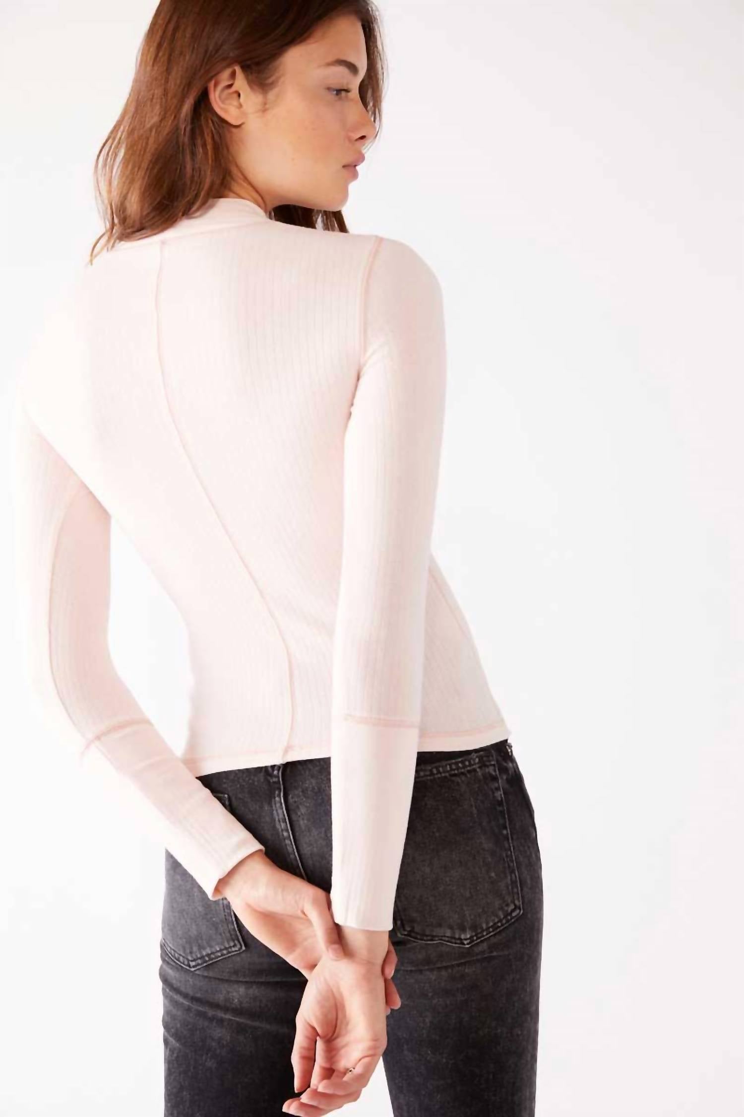 O top Free People é feito de malha canelada com gola falsa e mangas compridas. Possui modelagem ajustada e estrutura tipo pulôver, medindo aproximadamente 56 cm de comprimento. O material é uma mistura de algodão e elastano e pode ser lavado na máquina. Importado.