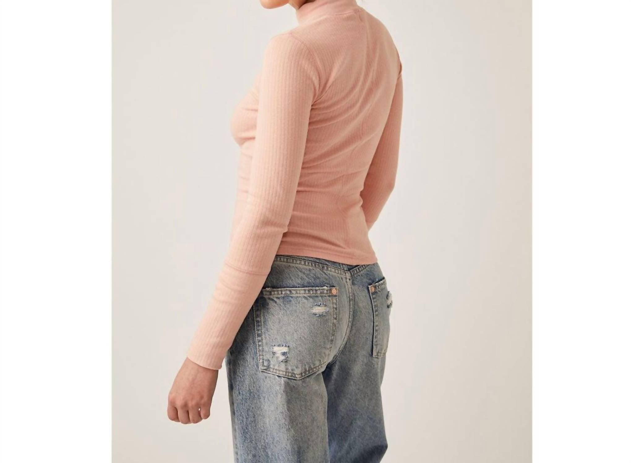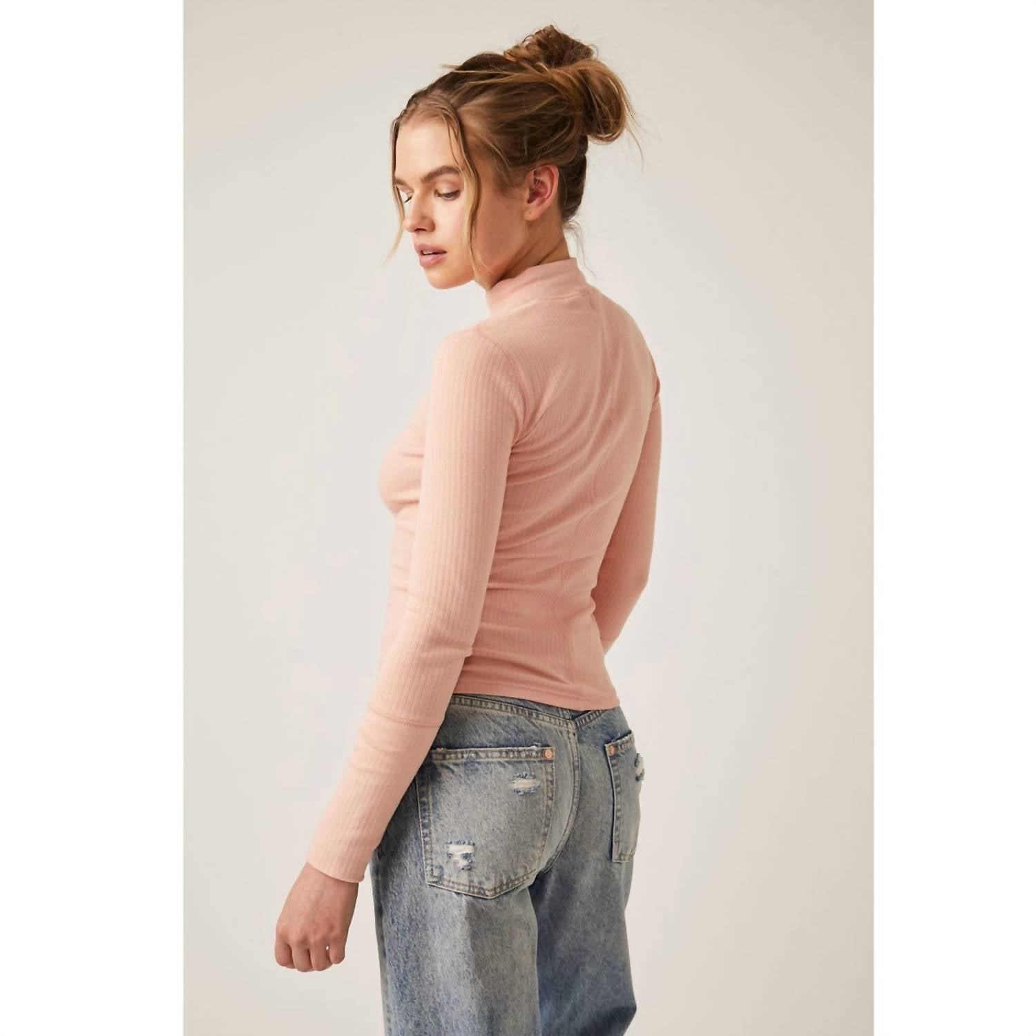 O top Free People é feito de malha canelada com gola falsa e mangas compridas. Possui modelagem ajustada e estrutura tipo pulôver, medindo aproximadamente 56 cm de comprimento. O material é uma mistura de algodão e elastano e pode ser lavado na máquina. Importado.