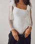 Details: Fabric: Soft, stretchy fabrication. Classic scoop neckline. Long sheer sleeves with adjustable bowtie detailing. Snap-button closure. Model is 5'8 | Wearing a S. 88% Nylon, 12% Spandex. Machine Wash Cold