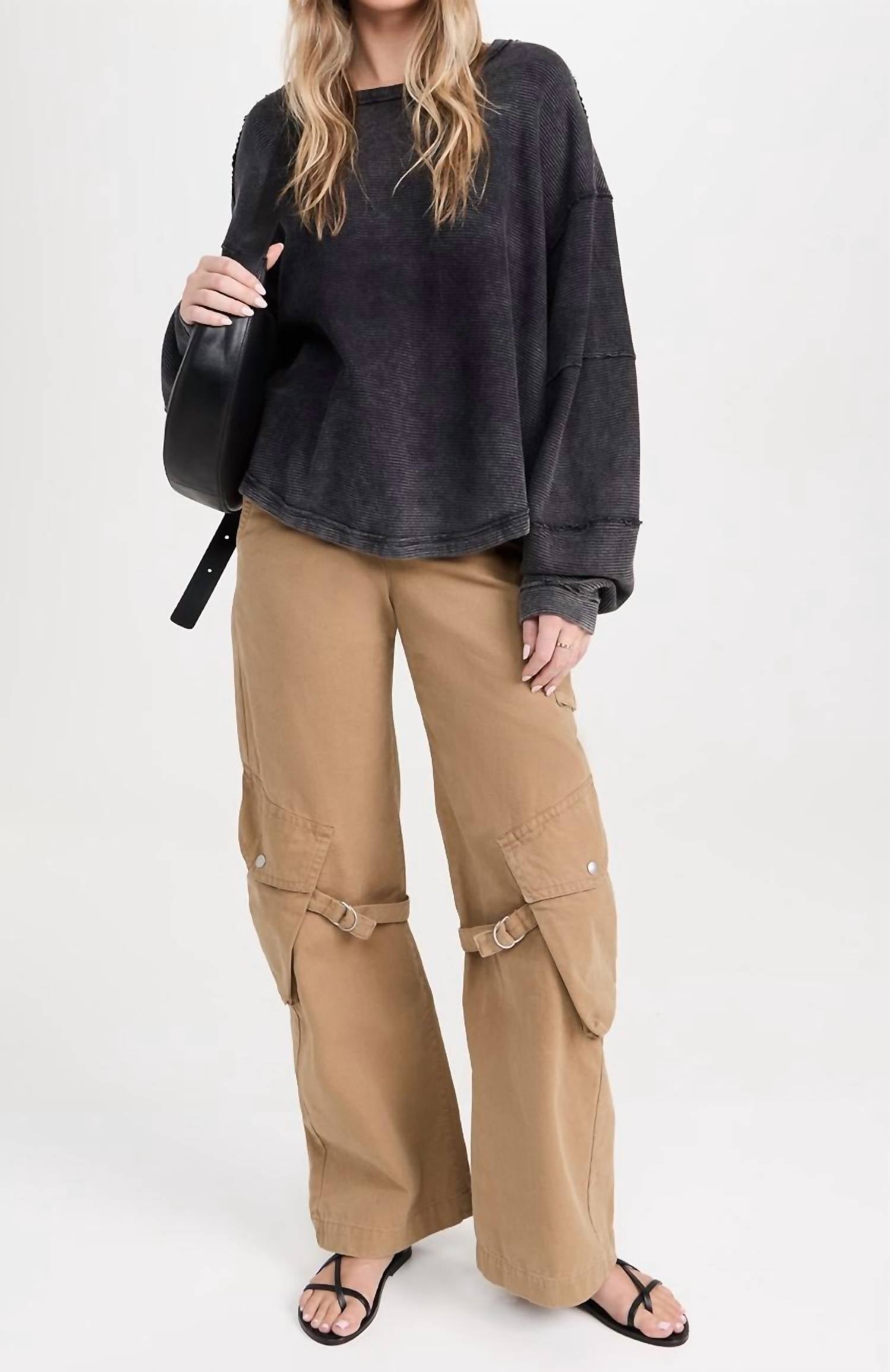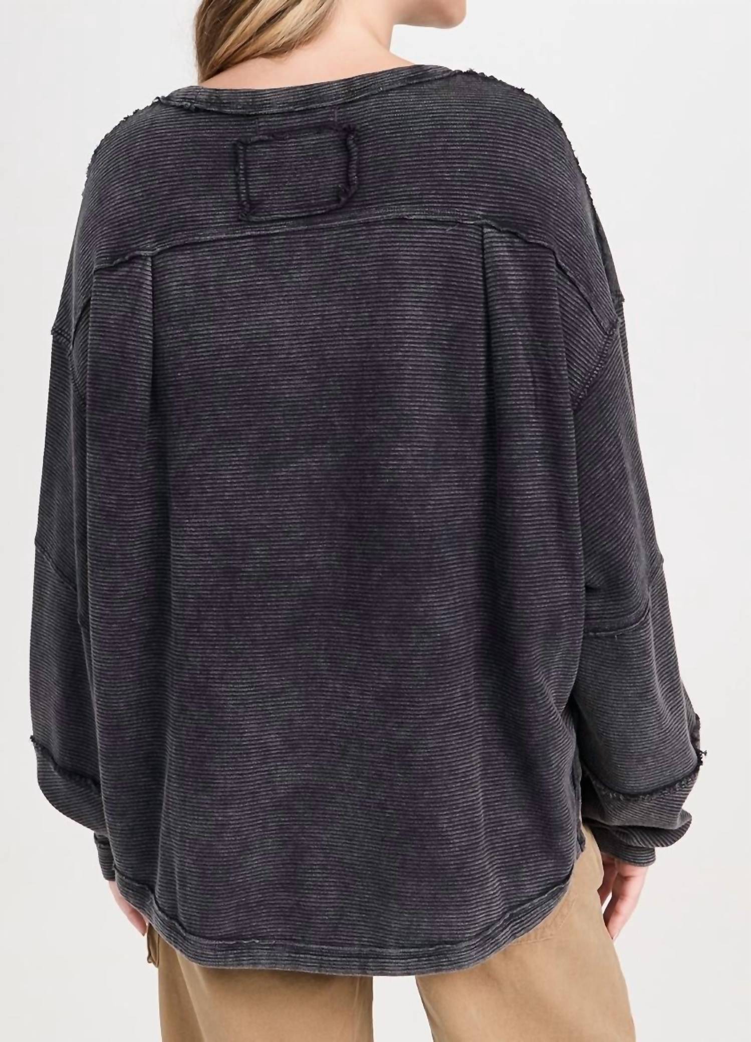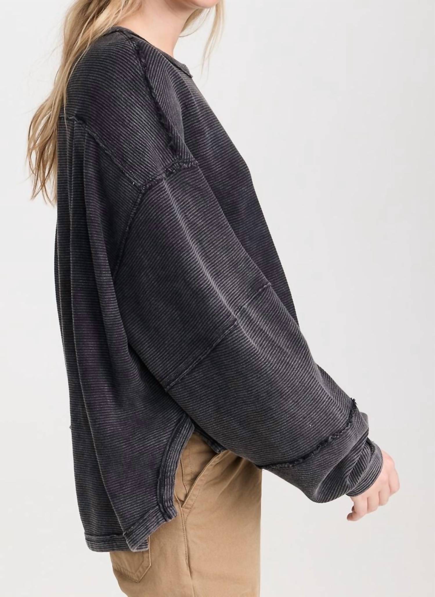 Tecido: Malha canelada de peso médio. Bordas cruas. Decote redondo. Mangas longas estilo dolman com ombros caídos. Exterior: 100% algodão. Lavagem à máquina. Importado do Paquistão.