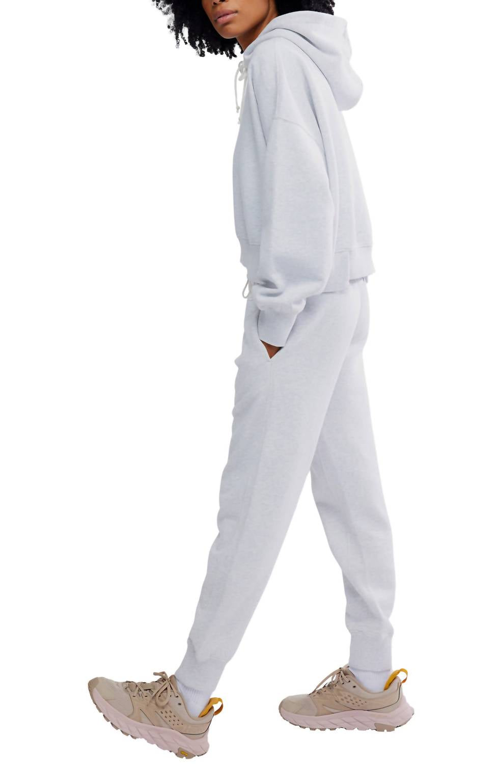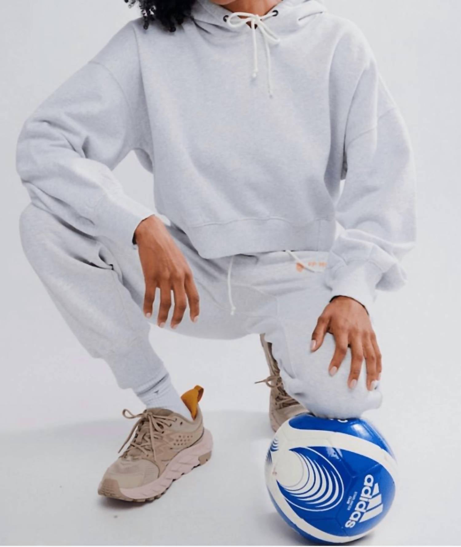 A set so cute you'll never want to take it off. Designed to look good while lounging, this little number is the perfect outfit for hanging at home in style. Experience ultimate comfort with the Free People Undefeated Set, a perfect blend of style and coziness in light heather gray. This women's loungewear set features long sleeves with ribbed cuffs on the hoodie and slouchy joggers with an elastic waist, designed in soft, cotton-forward fleece. Made from 80% cotton and 20% polyester, this imported set is easy to care for—simply machine wash and tumble dry. Hoodie: 20 1/2" length; Joggers: 27 1/2" inseam, 10" leg opening, 11" front rise, 13" back rise.