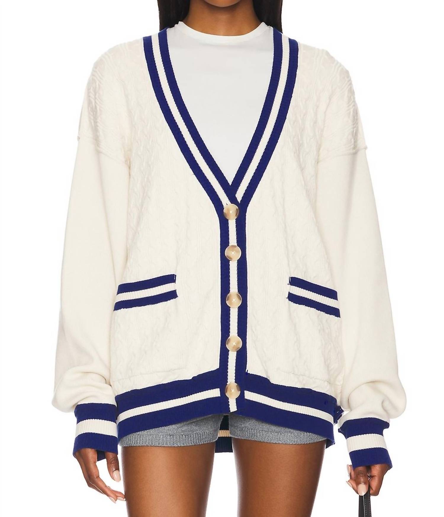 Cardigan estiloso em cru. Possui mangas compridas. Confeccionado em malha de algodão de gramatura média, oferecendo conforto e flexibilidade. Com comprimento de 68 cm. Inclui bolsos frontais e fecho de botão para maior praticidade. Fabricado na Índia. Fácil de cuidar, com instruções de lavagem à máquina.