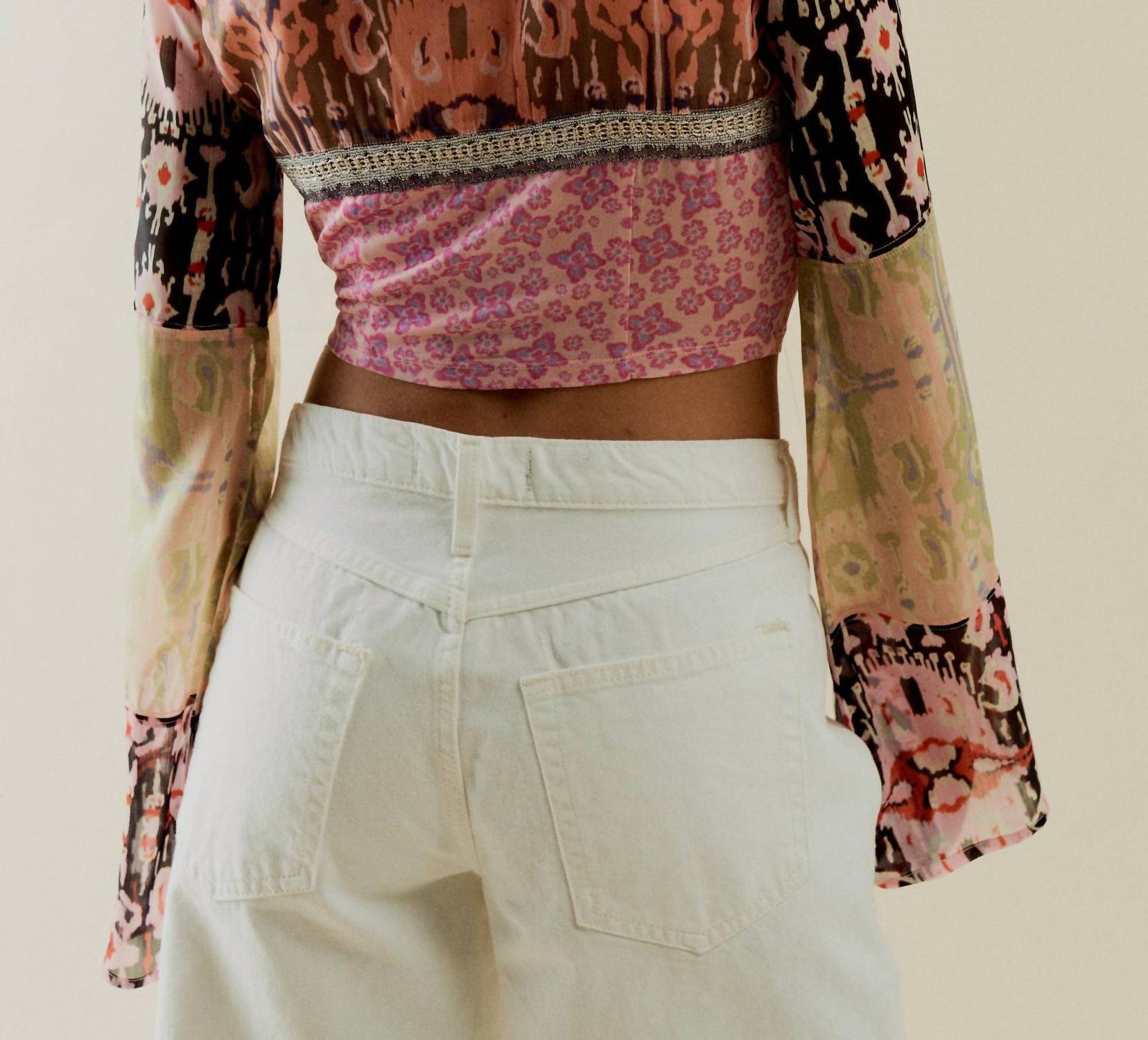 Mangas largas emolduram este top curto com decote aberto, projetado com uma mistura de estampas vibrantes.