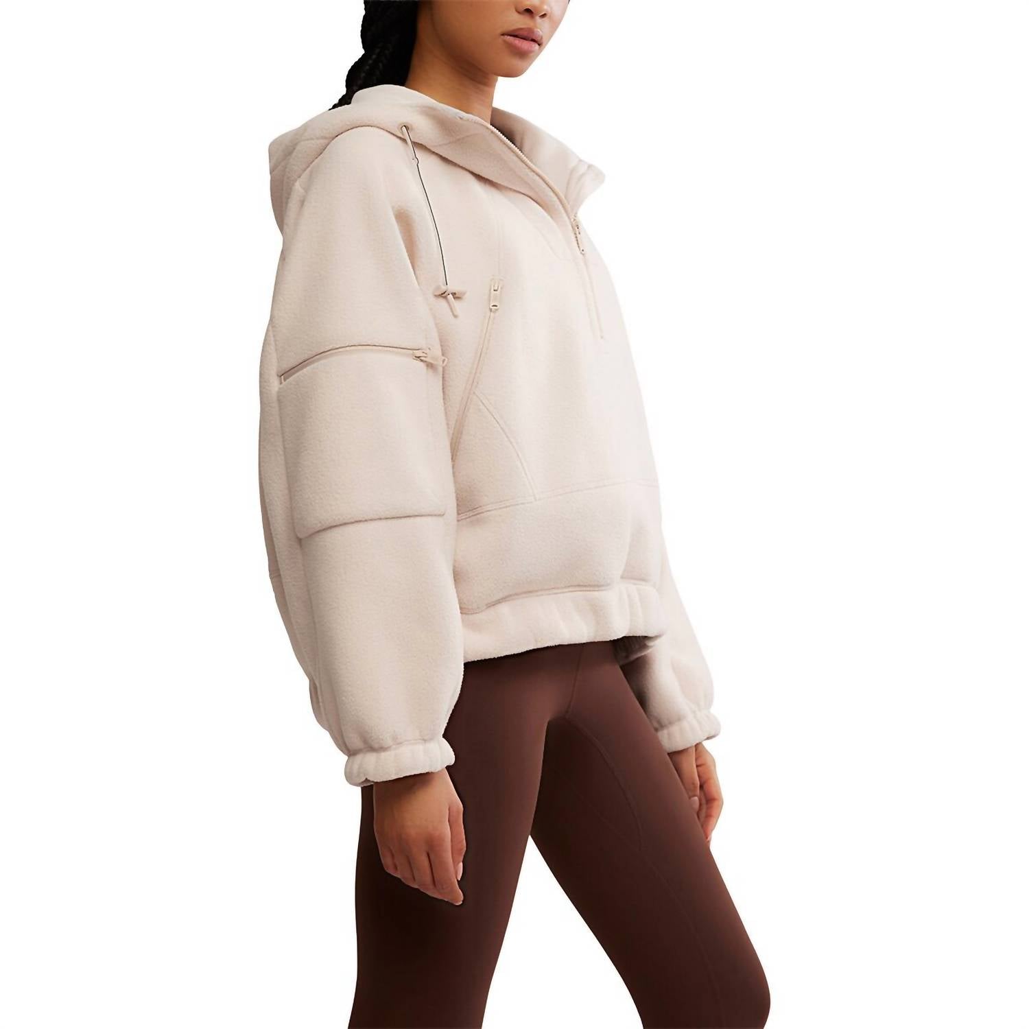Cozy fabric, impeccable design - Meet the sweatshirt that you'll never want to take off. Introducing the Wild and Free Fleece Pullover by Free People, a must-have piece in Cashmere designed for cool-weather comfort. This long sleeve pullover is crafted from 100% polyester fleece, known for its softness, warmth, and lightweight feel. It features a snood-style neckline, hood detail, and convenient half-zip closure for easy styling and ventilation. With exaggerated pockets and elasticated hem, this piece ensures both functionality and a relaxed, oversized fit for trail-to-town versatility.