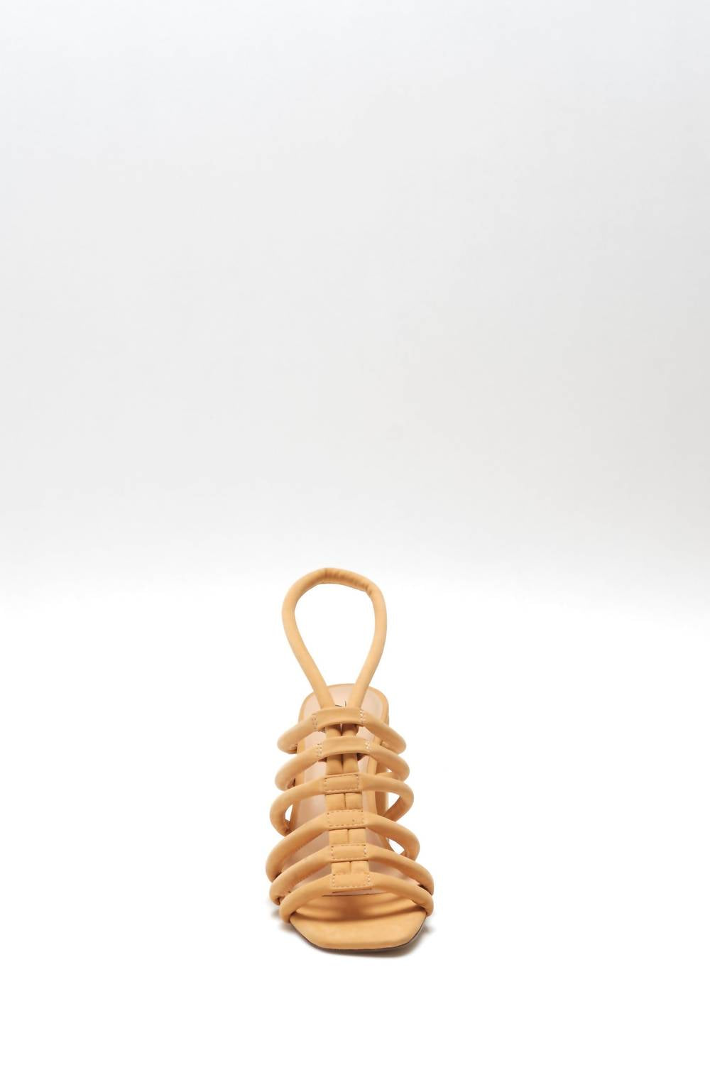 Estilo slip-on e couro macio e amanteigado com tiras grossas e redondas, palmilha com bico quadrado e salto bloco em estilo pirâmide. Salto: 8,9 cm.
