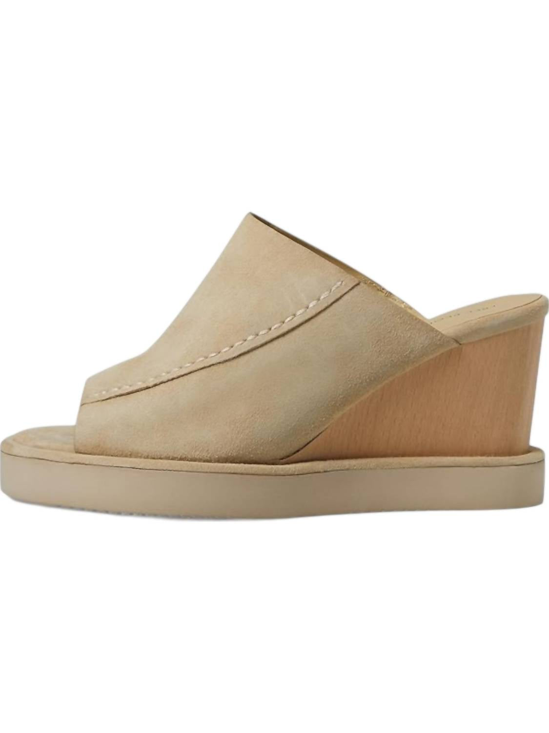 Design slip-on, sem costas. Fabricado em camurça com detalhes costurados. Salto plataforma de madeira. Solado de espuma. Biqueira redonda aberta. Palmilha de camurça confeccionada com couros nobres e materiais premium.