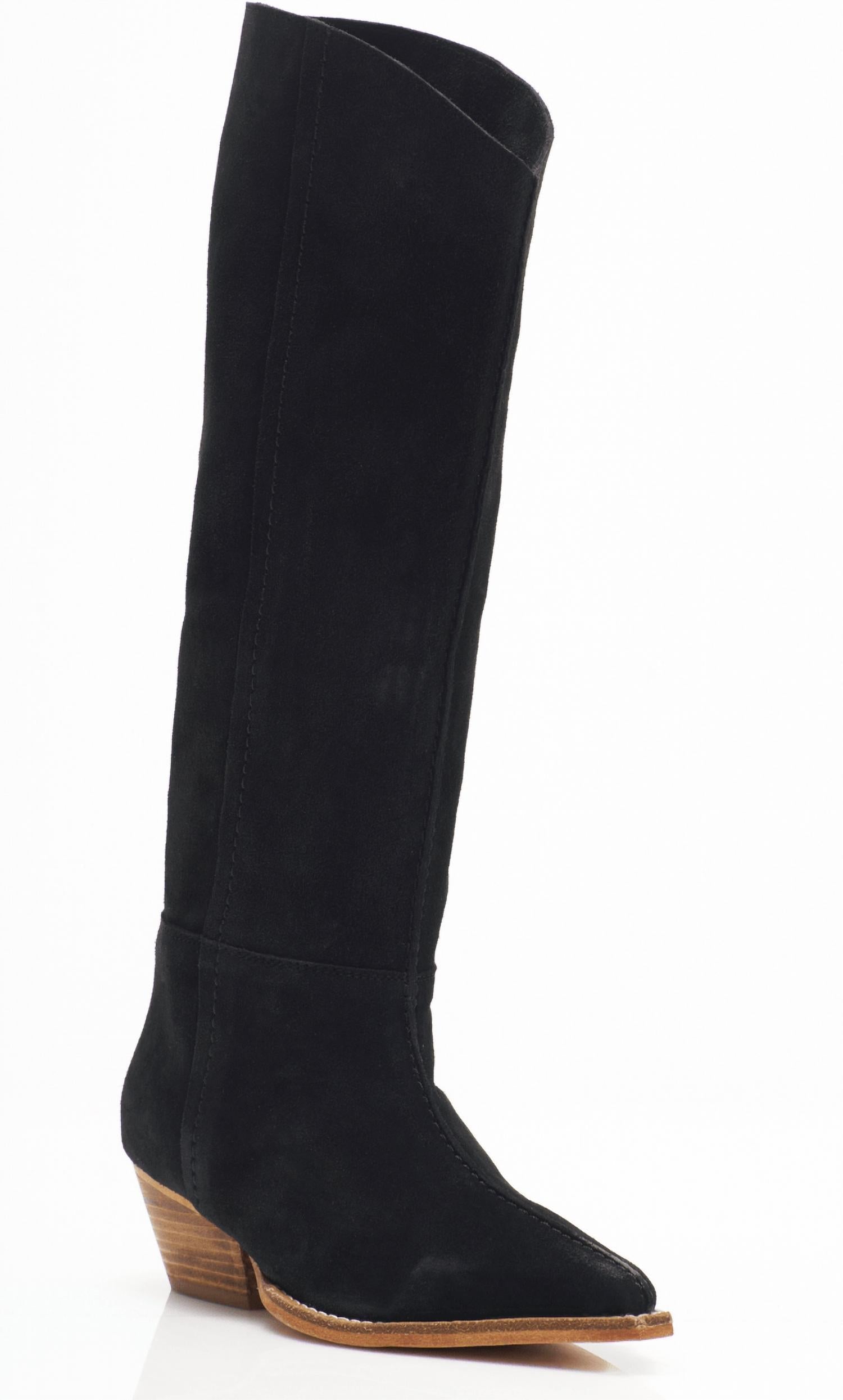 Confeccionadas em camurça preta, estas botas de salto apresentam cano de 40 cm de altura e circunferência de 28 cm, perfeitas para exibir o estilo Western Slouch. Apresentam bico fino e salto manejável de 5 cm, tornando-as uma adição versátil à sua coleção de calçados.