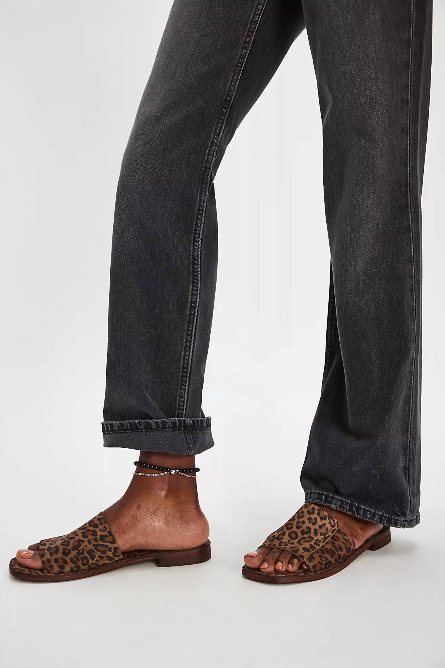 Step out in style with the Verona Slide Sandal by Free People, featuring a striking leopard print design that's bound to turn heads. These women's sandals boast a comfortable slip-on style with a flat heel and a sophisticated square toe detail. Crafted from worn leather, they're ideal for summer outings, whether you're heading to the beach or a relaxed dinner. If you're between sizes, consider sizing up to ensure the perfect fit.