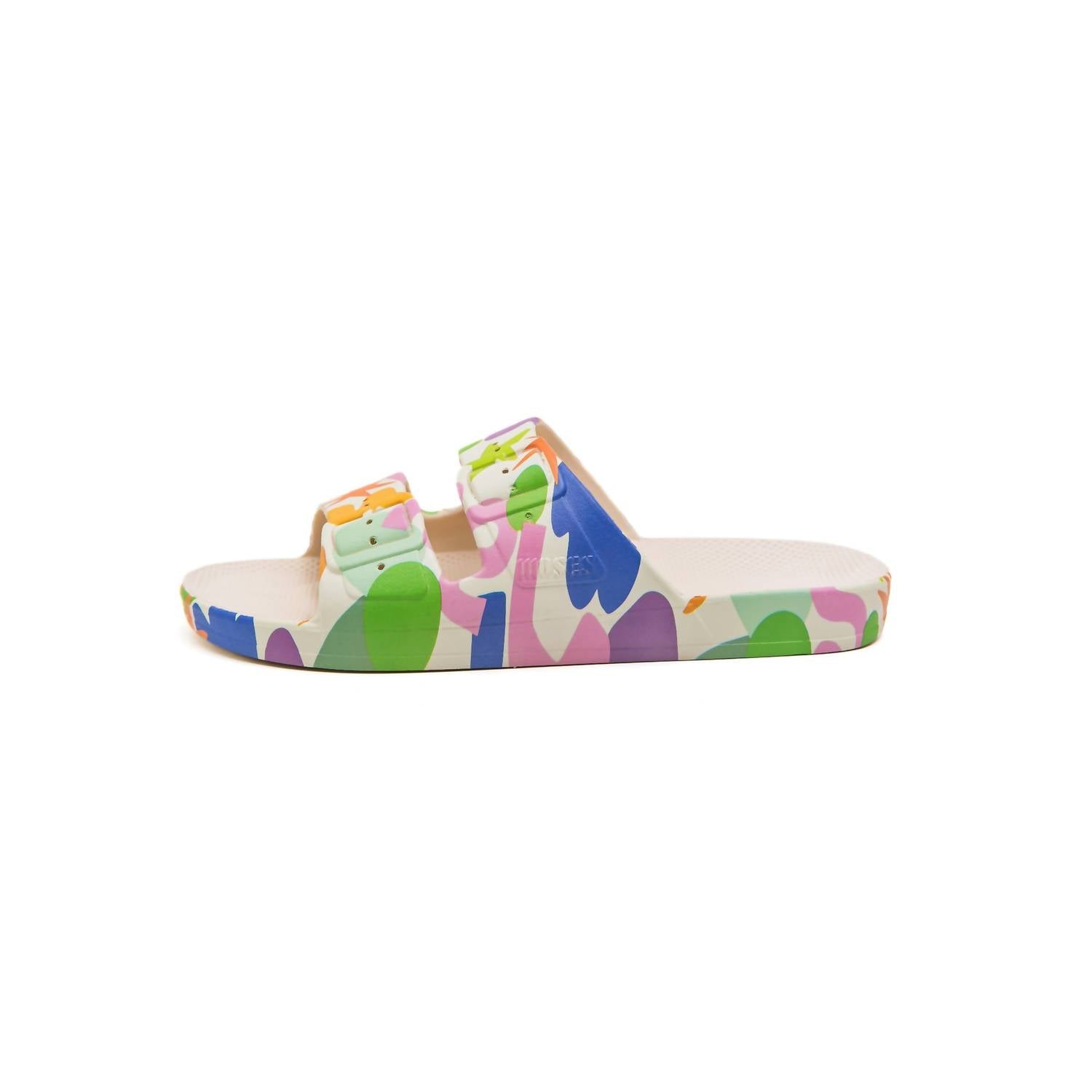 Slip into the Freedom Moses Adult Playstone Sandals, perfect for a beach day under the sun. These women's sandals, available in multicolor, are crafted from flexible PVC for durability and a great grip. Designed with an open toe and flat heel, they are waterproof, vegan, and infused with delightful artificial oils to smell like milk and honey. Made from a single mold, these slides are washable for easy maintenance.
