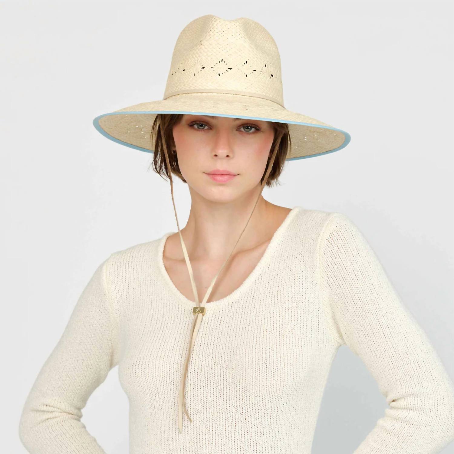 Elevate your style with the Women's Fiji Woven Straw Hat by Freya, a luxurious rendition of the classic lifeguard hat. This fedora showcases a premium woven design made from Paja Toquilla straw and is accentuated with a wide 10cm brim and leather chin strap. It's available in sizes XS (55cm), Small/Medium (56-57cm), and Large (58-59cm). The natural and sky color combination adds a touch of elegance to any ensemble.