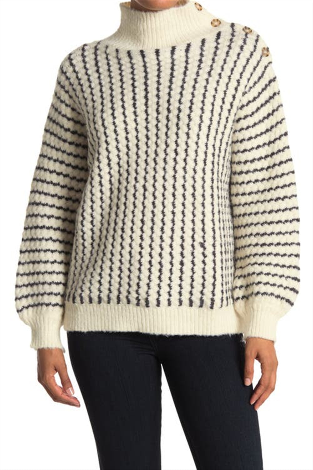 Design de gola falsa | Detalhe de botão no ombro | Listra francesa preta/branca | Tamanho médio | Material de alta qualidade | Aconchegante e confortável | Adequado para o outono/inverno | Ideal para ocasiões casuais/formais | Fácil de usar em camadas | Disponível na Nordstrom