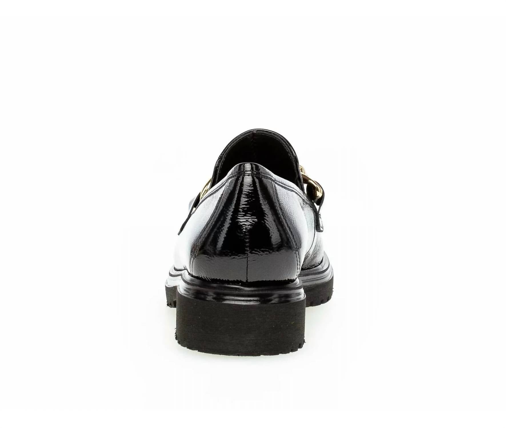 Introducing the Gabor Comfort Women's Wrinkle Lack Loafers in sleek black, a staple for chic engagement settings. These loafers showcase a convenient elastic closure and boast a block heel of 3.5 cm for elevated comfort. The upper is crafted from high-quality patent leather, complemented by a luxurious leather lining and a round toe for a timeless appeal. Perfect for spring occasions, these loafers epitomize understated luxury and style.