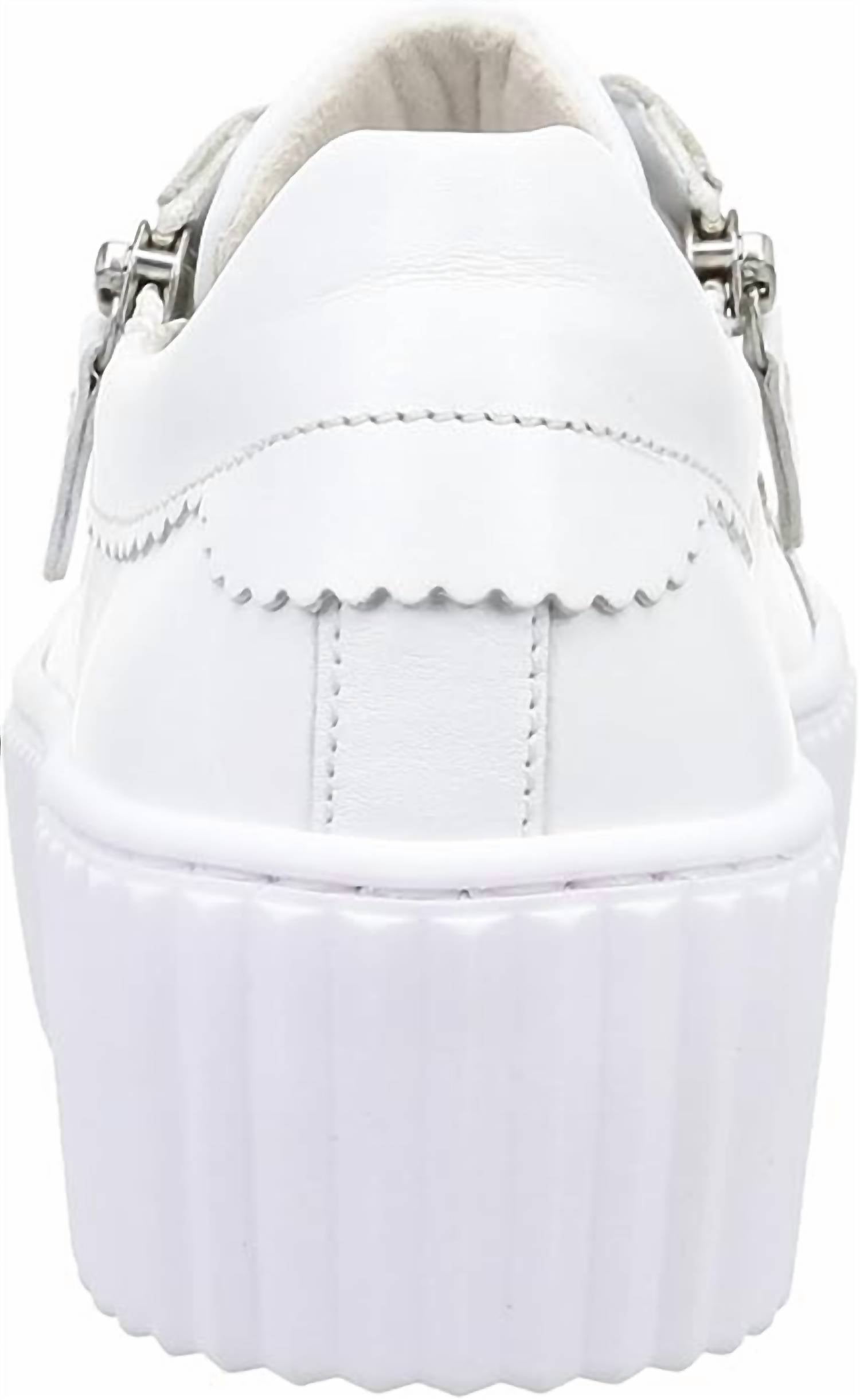 Cute, functional, and comfortable. These sneakers check all the boxes. Introducing the Women's Gabor Sneaker in crisp white leather, expertly crafted for both style and functionality. This sneaker features a convenient combination of laces and zipper closure, and an approximately 1" platform heel for a modern touch. Its round toe design enhances comfort, while the removable footbed allows for personalized orthotic use. A perfect choice for those seeking both fashion and custom fit in their everyday footwear.