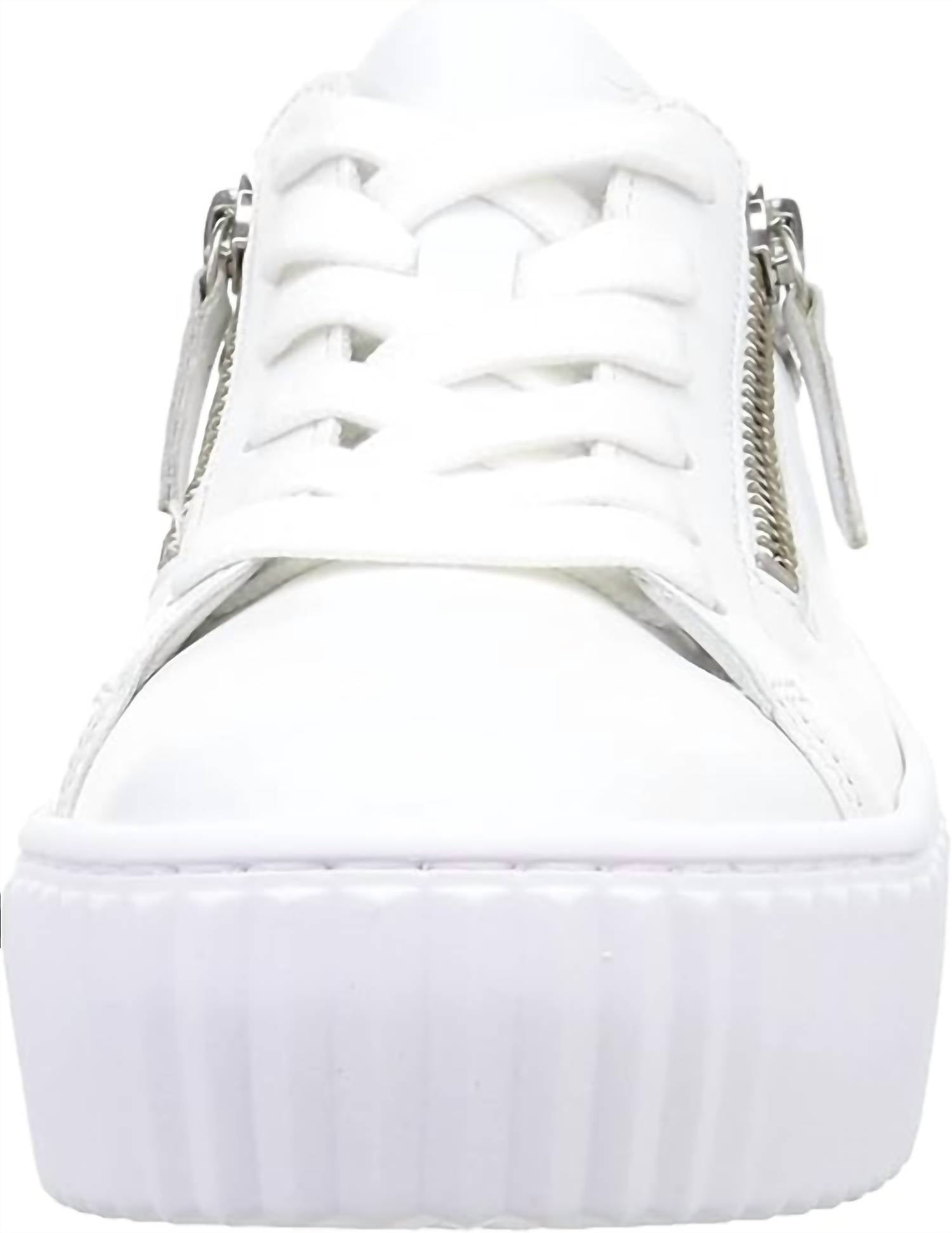 Introducing the Women's Gabor Sneaker in crisp white leather, expertly crafted for both style and functionality. This sneaker features a convenient combination of laces and zipper closure, and an approximately 1" platform heel for a modern touch. Its round toe design enhances comfort, while the removable footbed allows for personalized orthotic use. A perfect choice for those seeking both fashion and custom fit in their everyday footwear.
