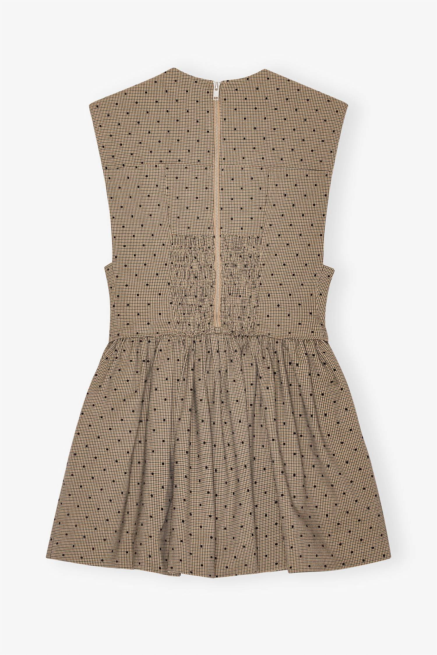 Apresentamos o Vestido Curto Flock Check da GANNI, um elegante vestido curto sem mangas em um cativante tom Olho de Tigre. Confeccionado em uma mistura sustentável de 64% poliéster reciclado, 34% viscose LENZING™ ECOVERO™ e 2% elastano, esta peça estampada oferece estilo e conforto. O vestido possui decote redondo, bolsos frontais práticos e detalhe de blusa nas costas, complementado perfeitamente por uma silhueta evasê em A. Fecha com zíper nas costas e é lavável à máquina para facilitar a limpeza.
