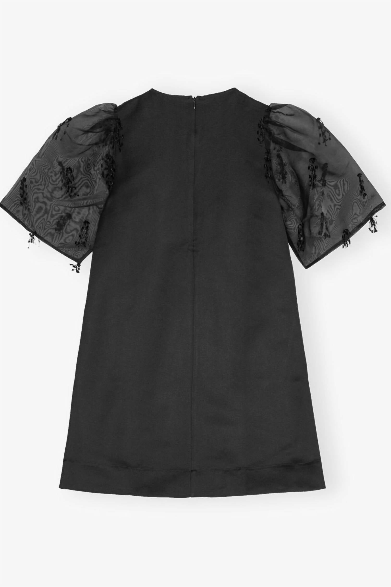 O Vestido Curto de Organza com Franjas GANNI é um complemento chique para qualquer guarda-roupa de verão, ideal para ir à igreja ou a qualquer ocasião elegante. Este vestido reto, em preto atemporal, apresenta uma estampa sólida com decote em V e mangas até o cotovelo. Confeccionado em 100% poliéster reciclado, possui fecho de zíper para facilitar o uso. As instruções de cuidado incluem lavagem à máquina com água fria, do avesso, em ciclo delicado, e secagem no varal, com recomendação de passar a ferro em temperatura baixa.