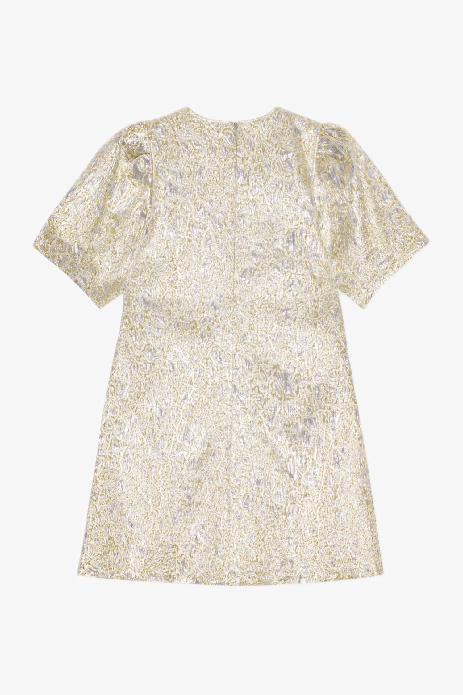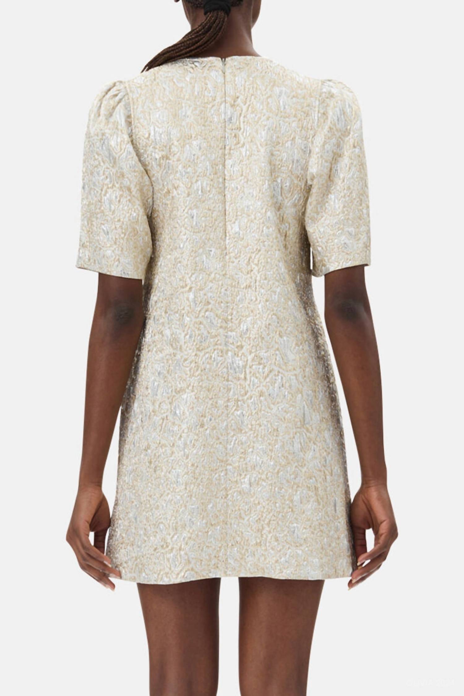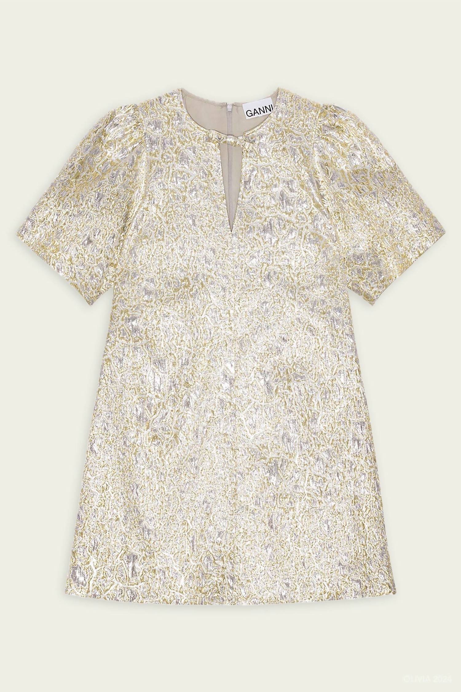 Um vestido curto e arejado para os dias mais quentes. O Vestido Mini Metálico em A da GANNI é uma peça marcante, criada para mulheres que buscam elegância com um toque de ousadia. Perfeito para festas de fim de ano, este vestido apresenta mangas curtas e um elegante decote em V, confeccionado em uma mistura de poliéster texturizado com fios metálicos para um efeito brilhante. Fabricado na China, o corte em A é realçado por um detalhe de laço decorativo na frente e é forrado com 100% poliéster reciclado. Fechamento: Fecho de zíper. Cuidados: Lavar somente à mão. Ideal para celebrações sazonais como a véspera de Ano Novo, este vestido reflete uma tendência maximalista.