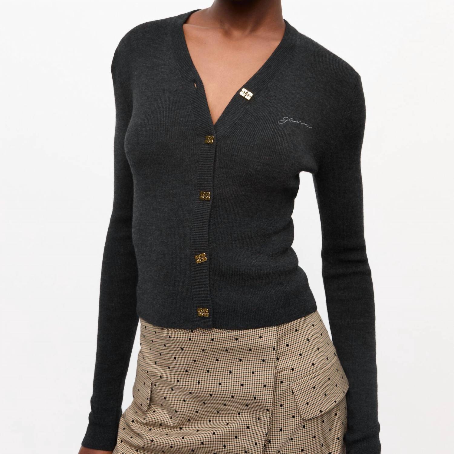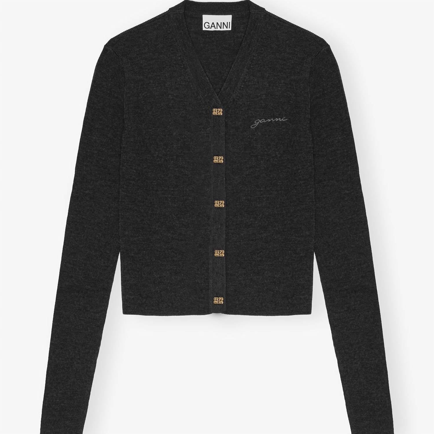 Um ajuste clássico que funciona tão bem abotoado quanto aberto. Eleve seu guarda-roupa com o Mini Cardigan Ribbed Merino da GANNI, ideal para mulheres que buscam um estilo refinado. Confeccionado em 100% lã merino, este elegante cardigan apresenta mangas longas, decote em V e um clássico fecho de botão. O destacado logotipo bordado da GANNI adiciona um toque de luxo à peça na cor Phantom. Perfeito para adicionar sofisticação a qualquer look.