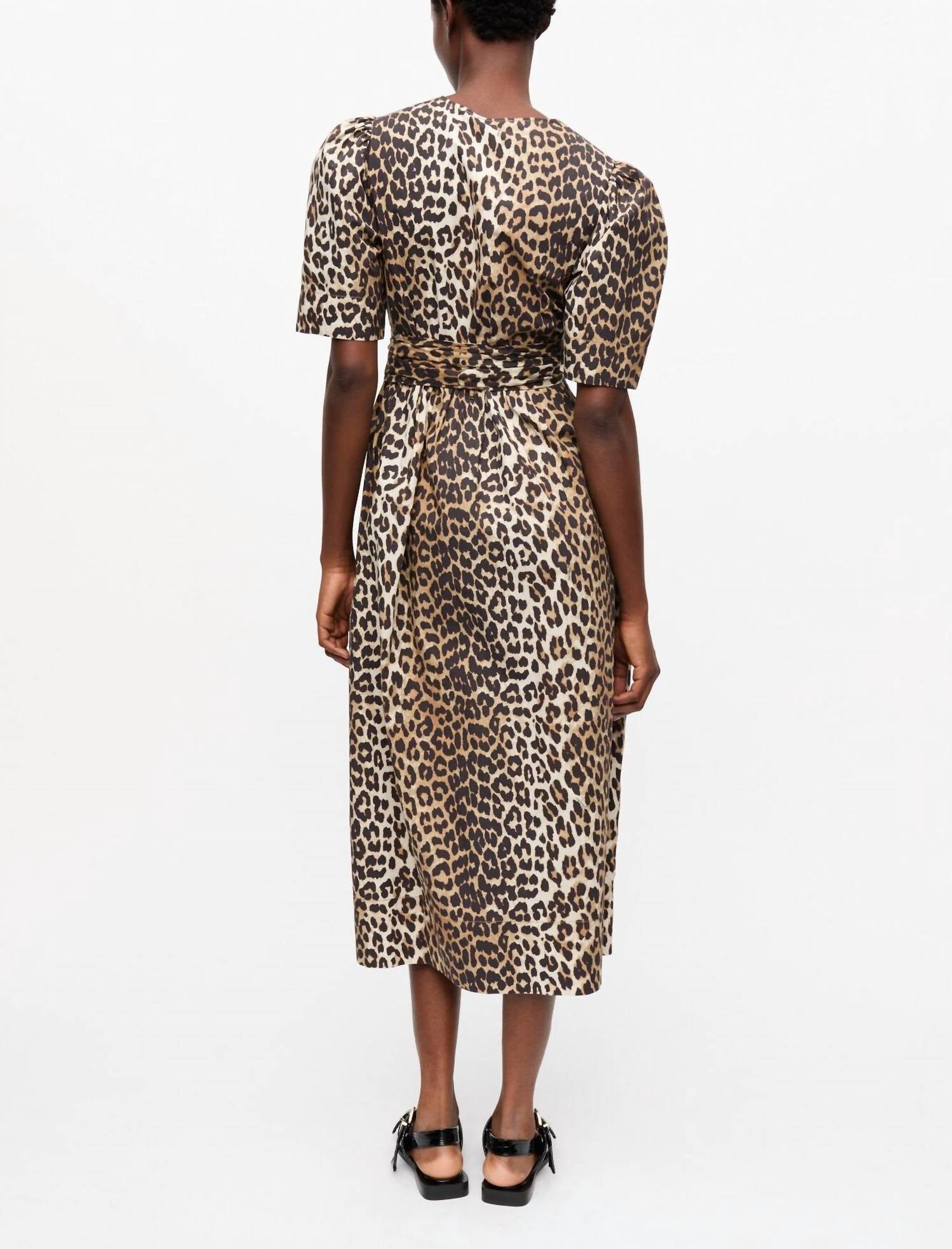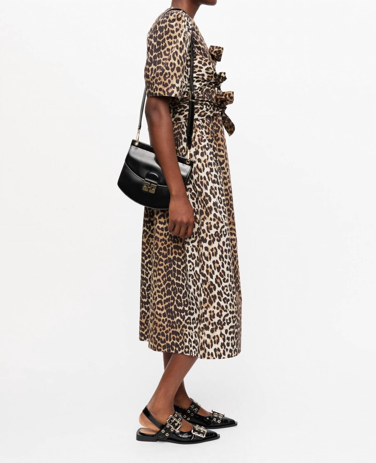 O vestido com o comprimento perfeito existe. Apresentamos o Vestido Midi de Algodão com Estampa de Leopardo e Alças Amarráveis da GANNI, uma peça elegante e marcante, perfeita para ocasiões de verão. Este vestido midi feminino, com corte em A, apresenta decote em V profundo, mangas curtas e uma estampa animal chique, confeccionado em 100% algodão orgânico. O fechamento é feito por três faixas de amarração na frente, adicionando um toque de sofisticação. Para cuidados, lave na máquina e seque no varal para manter a estampa vibrante e a textura macia.