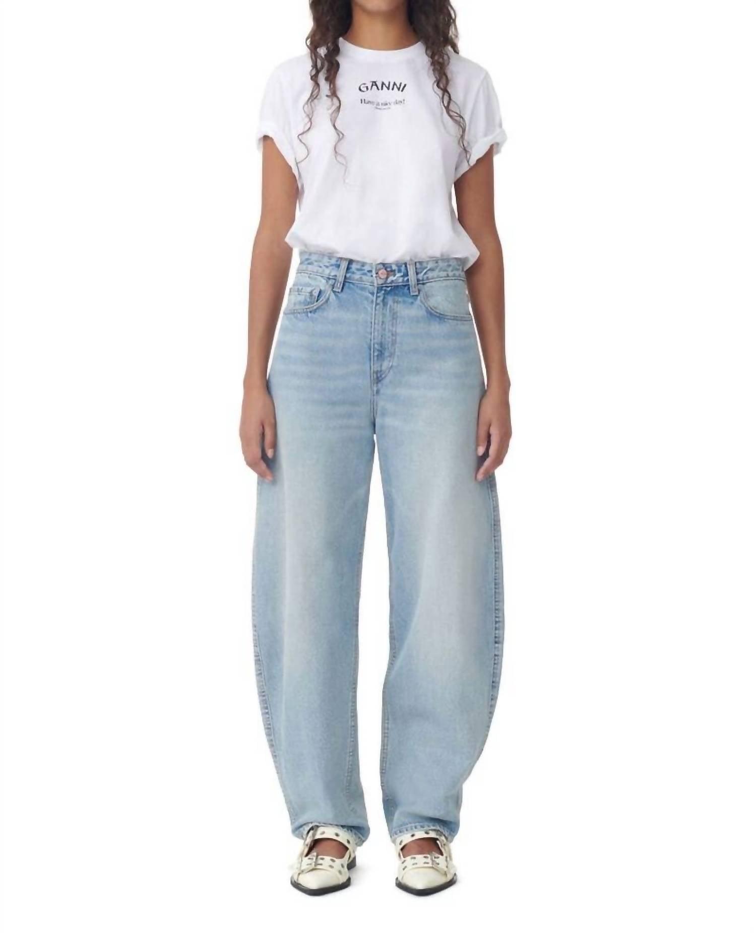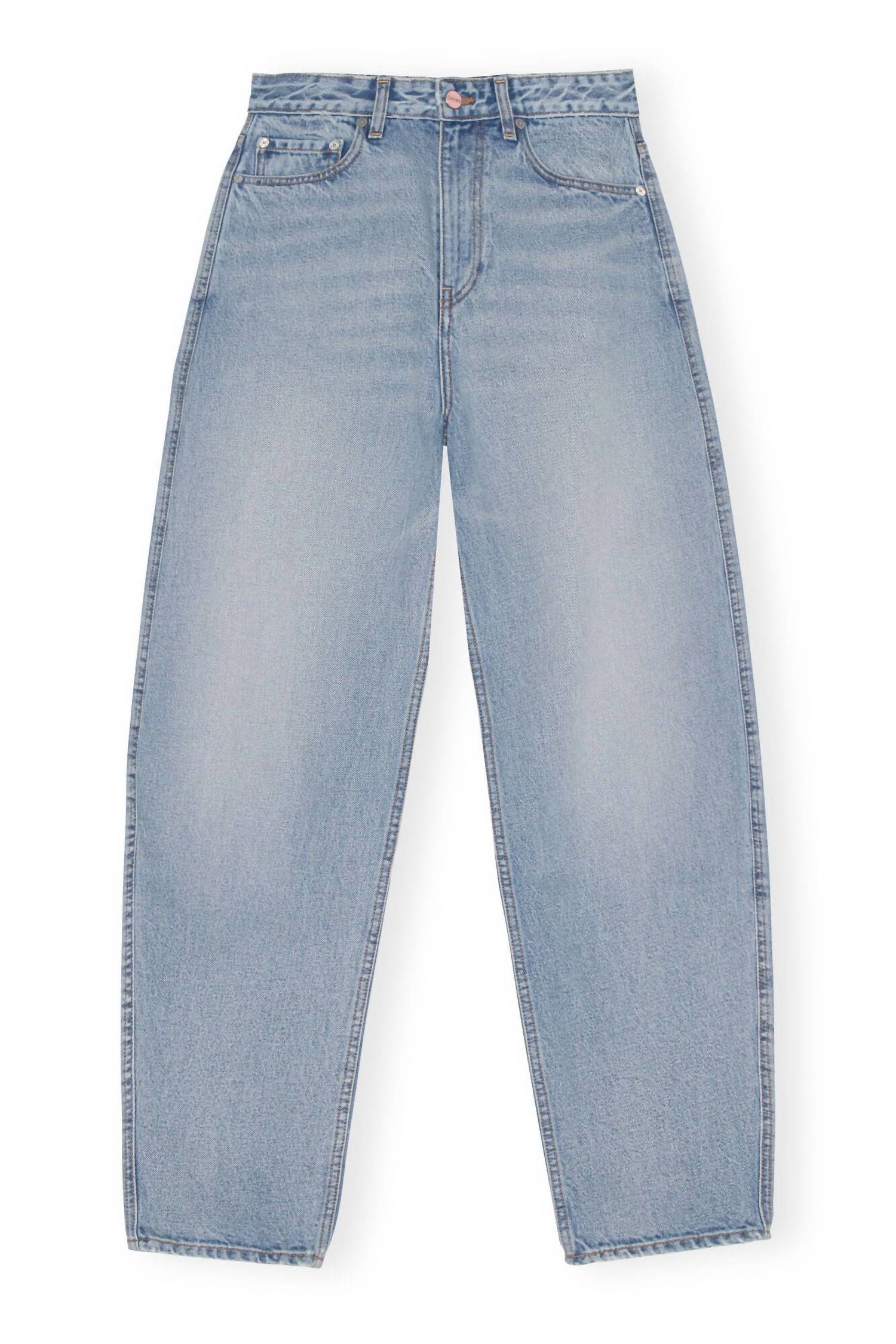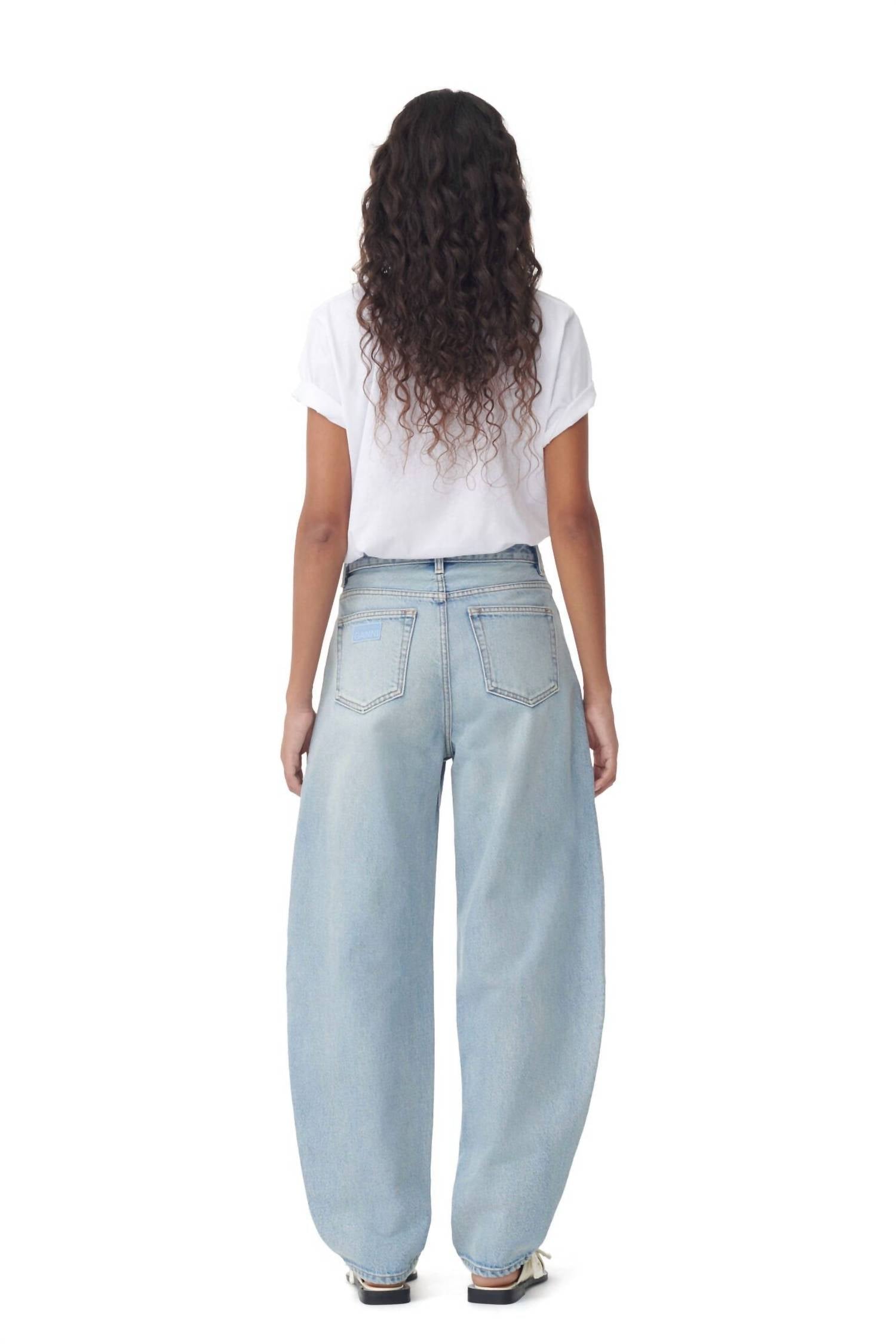 Cativante tom Light Blue Vintage, confeccionado inteiramente em 100% algodão orgânico. Possui cintura alta e caimento solto nos quadris e coxas. Apresenta silhueta curvada. O fechamento é garantido pelo estilo clássico de 5 bolsos, com passantes para cinto e fecho de zíper/botão para um uso seguro. Acompanha o icônico logotipo GANNI no bolso traseiro. Oferece uma combinação única de conforto e estilo.