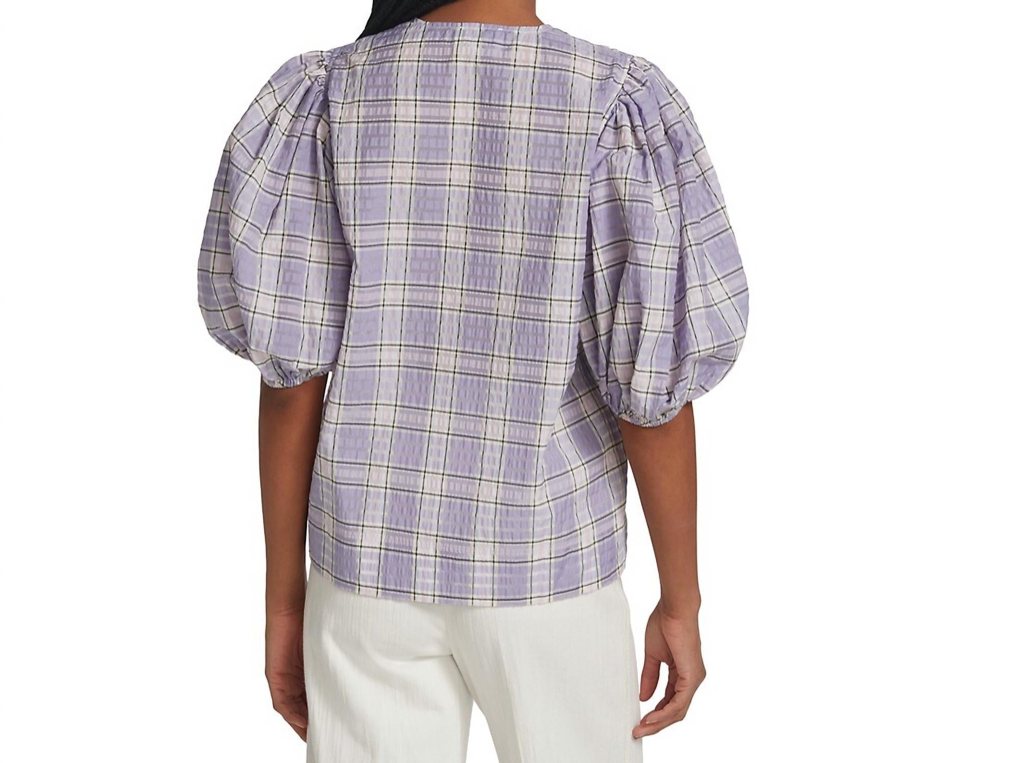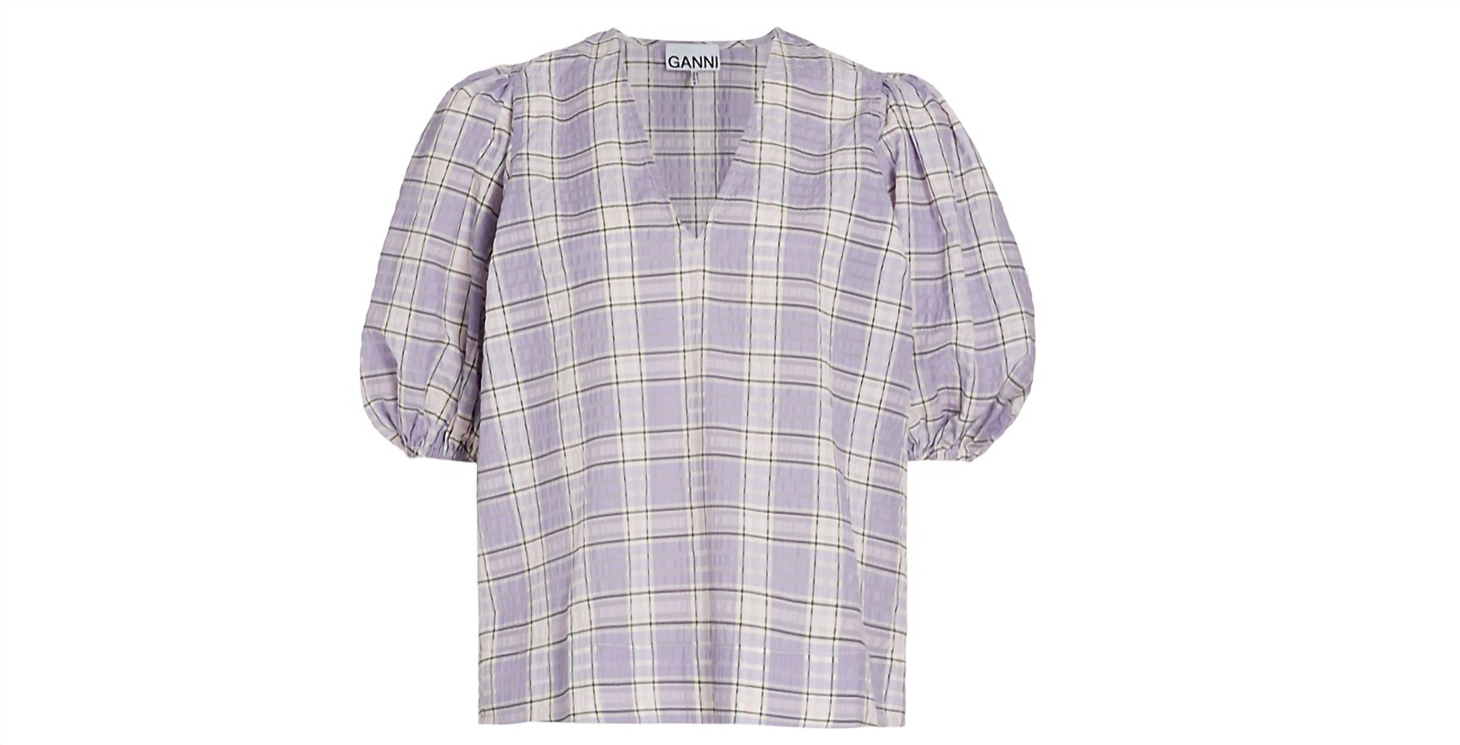 Uma blusa versátil que vai do escritório ao jantar! 100% algodão. Importado. Lavável à máquina. Manga bufante. Xadrez lavanda. Cerca de 63 cm do ombro à bainha.