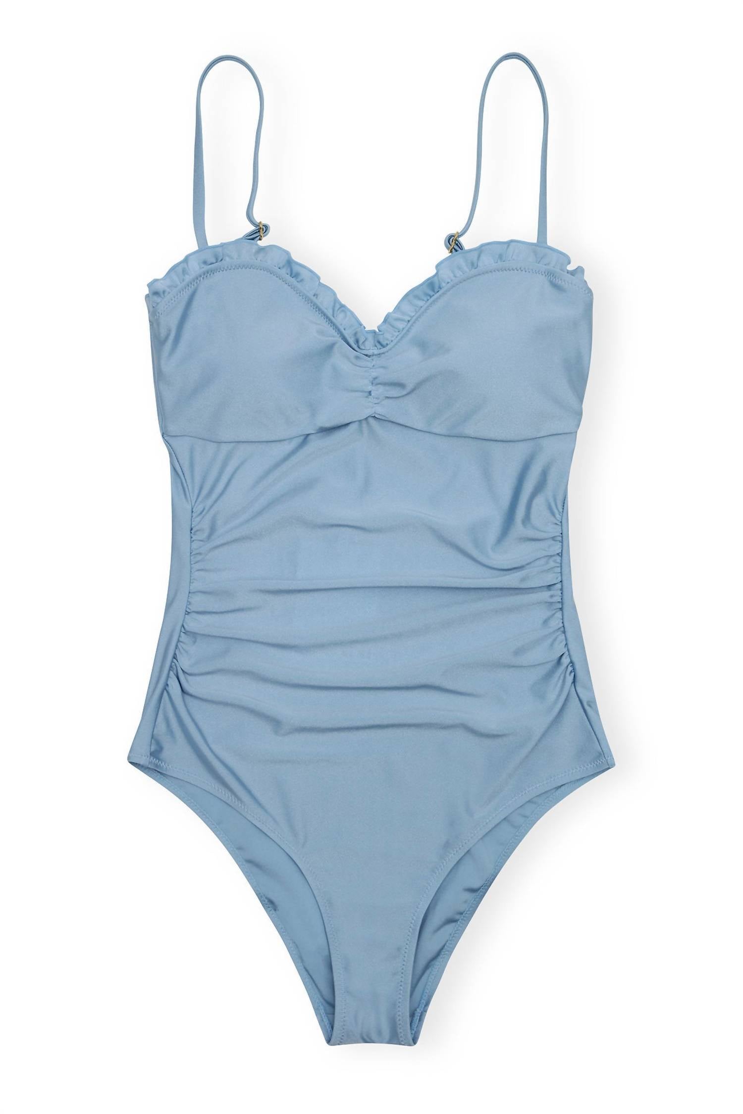 Make waves in the Ganni Shine Gathered One Piece Swimsuit, a glamorous choice in striking Glacier Lake blue. This swimsuit features adjustable straps for a tailored fit and a charming ruffled top, combining style with comfort. Composition: 80% recycled nylon, 20% spandex. Care: Machine wash, line dry.