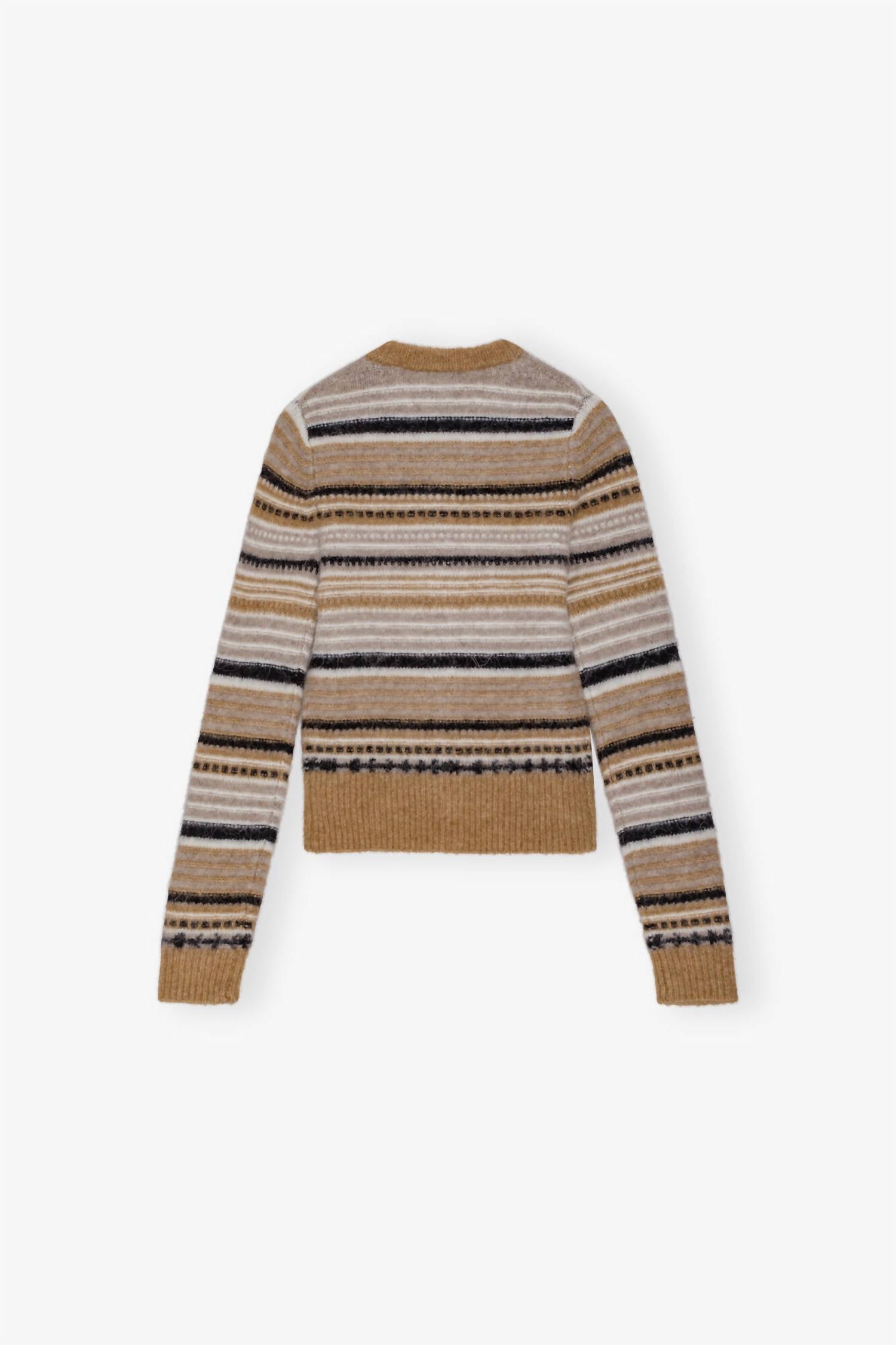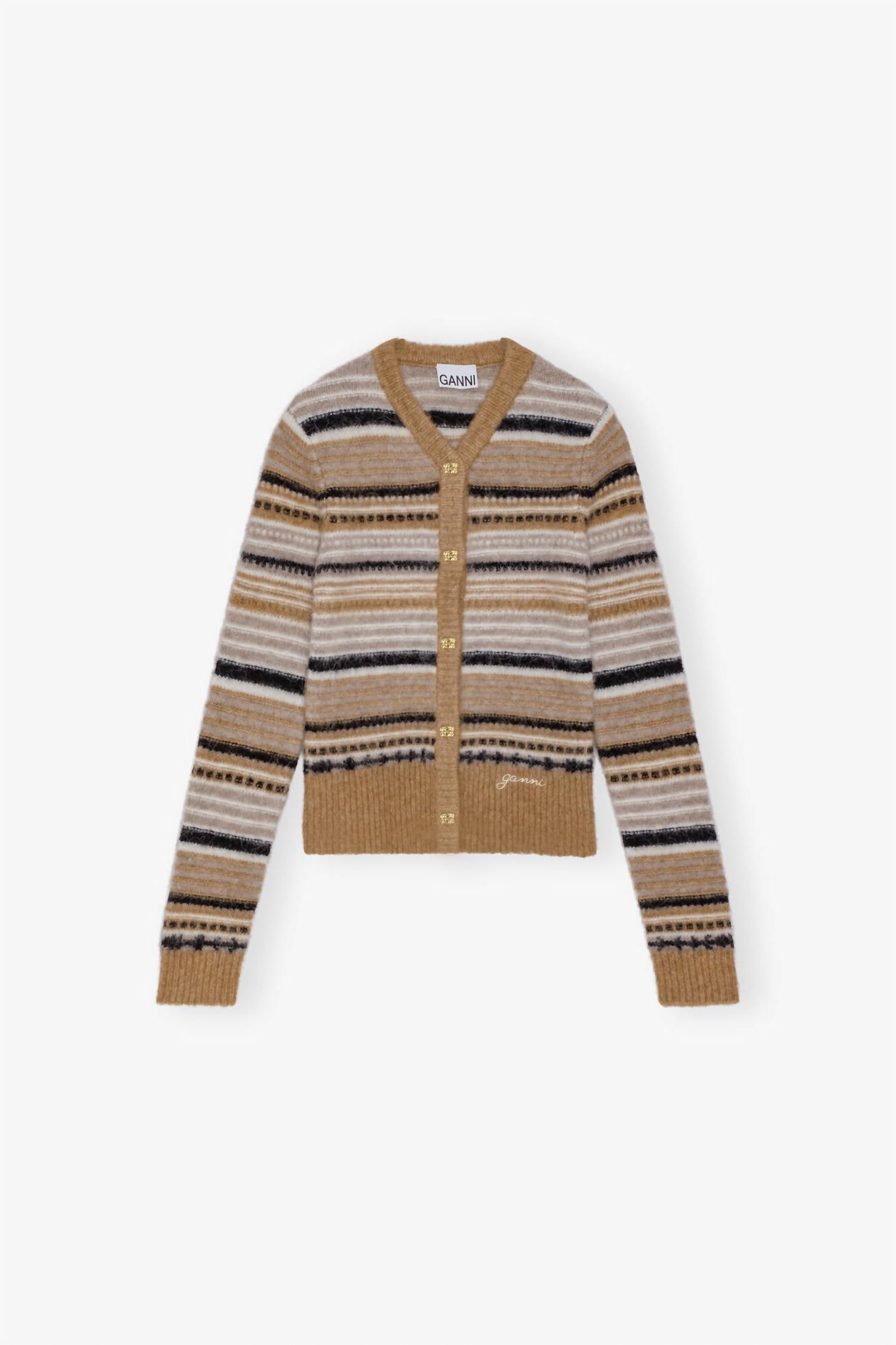 Use este adorável cardigan sobre qualquer camisola ou regata. Confeccionado em lã premium para maior aquecimento. Cardigan com estampa de olho de tigre. Possui mangas compridas e um elegante decote em V. Botões borboleta GANNI exclusivos para um toque único. Fecha com botão frontal e bordas caneladas para um ajuste perfeito. Lavar à mão, não usar alvejante, secar na máquina, passar a ferro ou lavar a seco, secar na horizontal, usar detergente para lã e não deixar de molho.