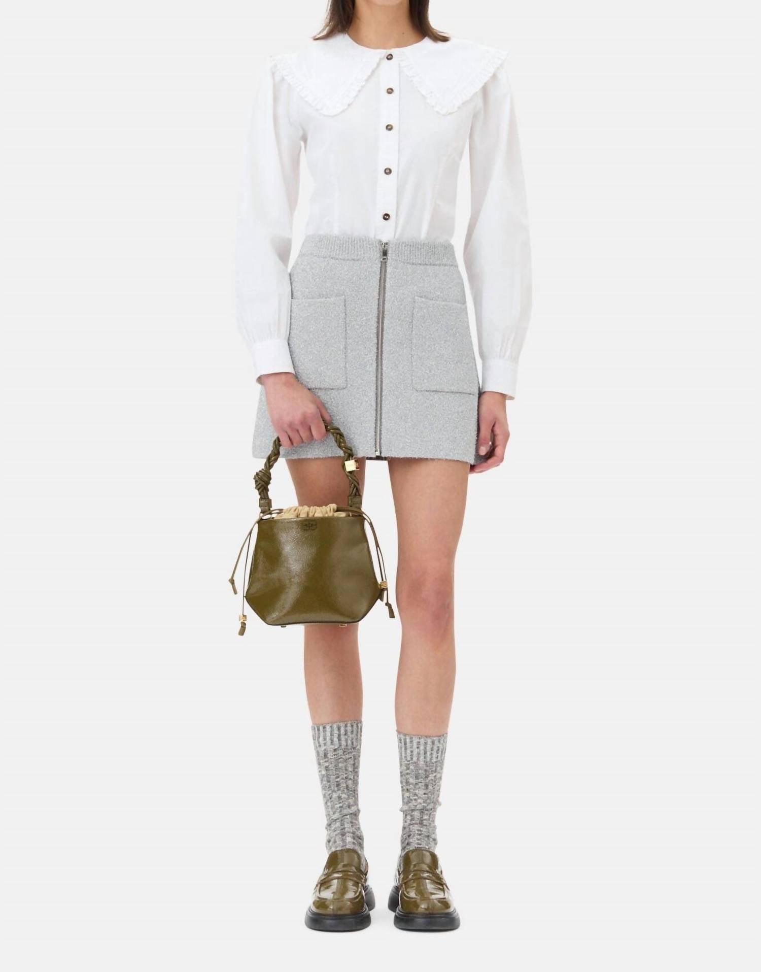 A minissaia perfeita existe. Peça chique que alia estilo e sustentabilidade. A saia de malha cinza apresenta um design elegante na altura da coxa, com fecho frontal por zíper e cós canelado. Complementada por dois bolsos tipo canguru frontais. Confeccionada em uma mistura exclusiva de 38% lã, 34% poliéster metalizado, 25% poliéster reciclado e 3% poliamida. Garante conforto e um visual moderno. Lavar somente à mão.