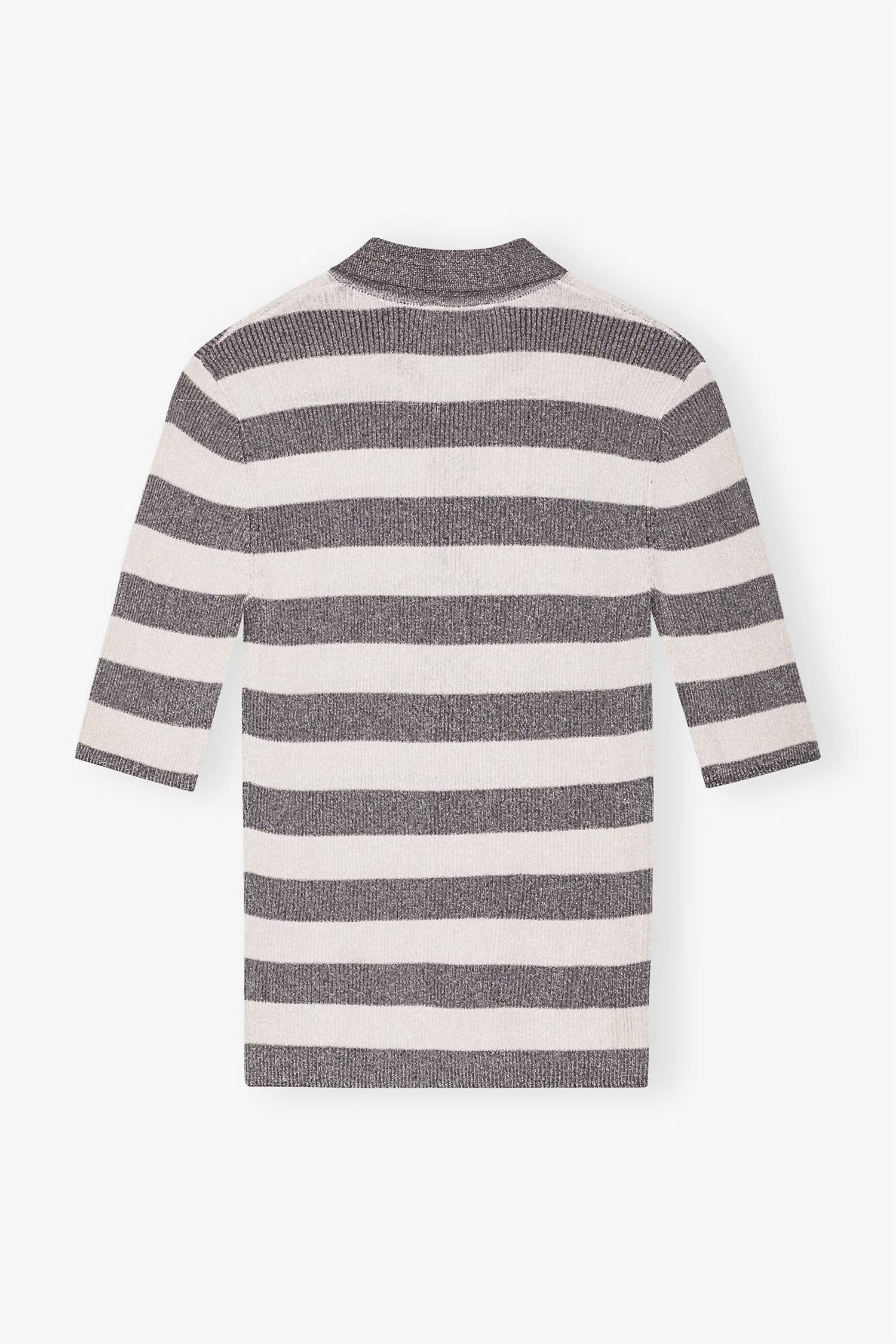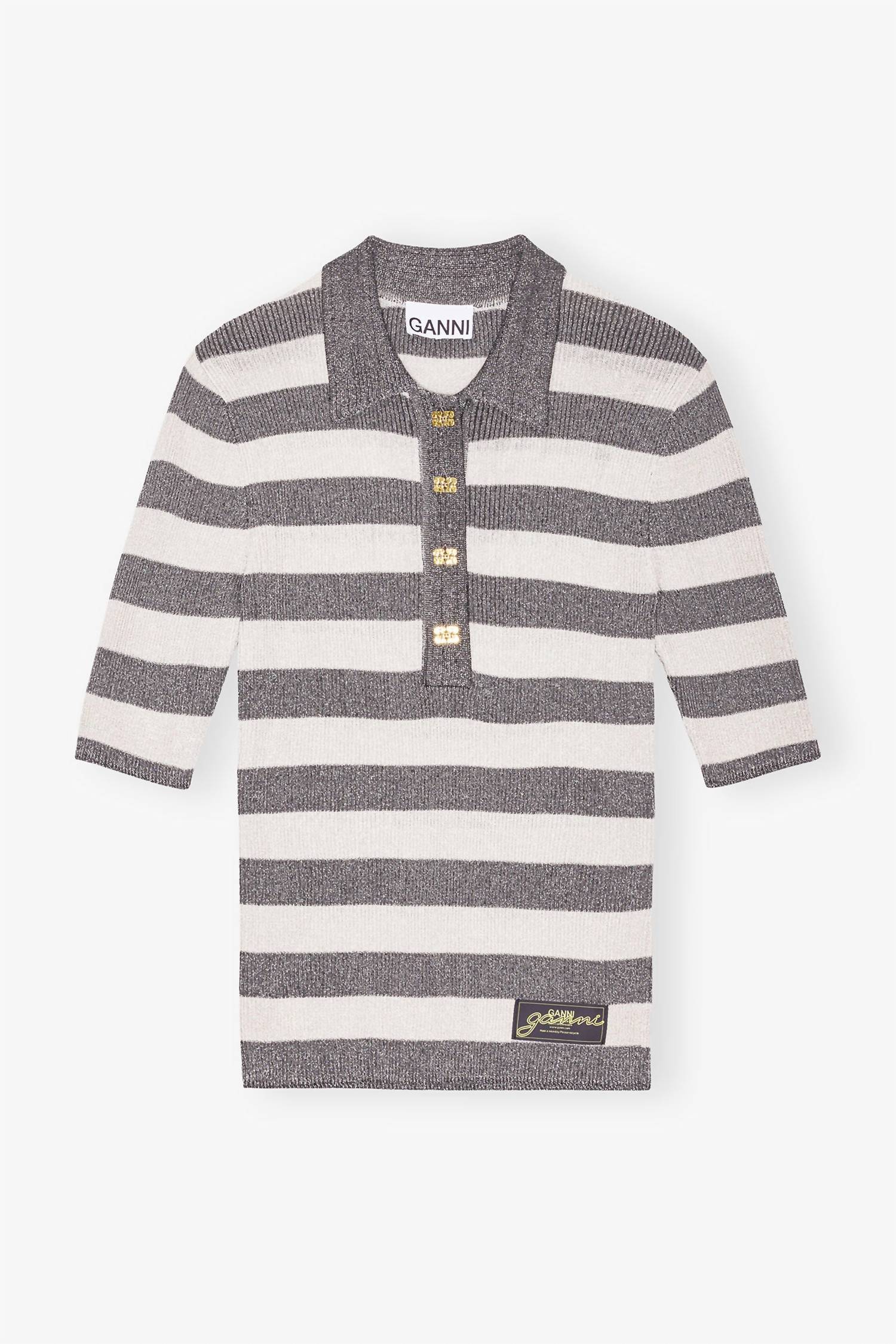 A camiseta de manga curta que você vai querer em todas as cores. Apresentamos a Polo Sparkle Rib da GANNI, uma adição chique ao seu guarda-roupa de primavera com um elegante padrão listrado Egret. Confeccionada com cuidado, esta polo apresenta mangas curtas e gola clássica. Sua composição inclui uma mistura de 50% viscose com nylon reciclado, poliéster reciclado e poliéster metálico para um brilho sutil. Fabricada na China, a polo fecha com um botão e requer lavagem à mão e secagem na horizontal para manter a delicadeza do tecido.