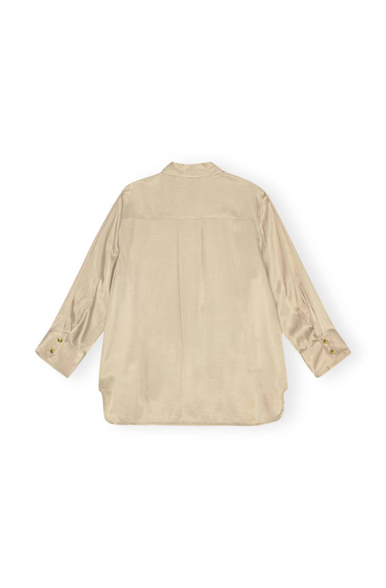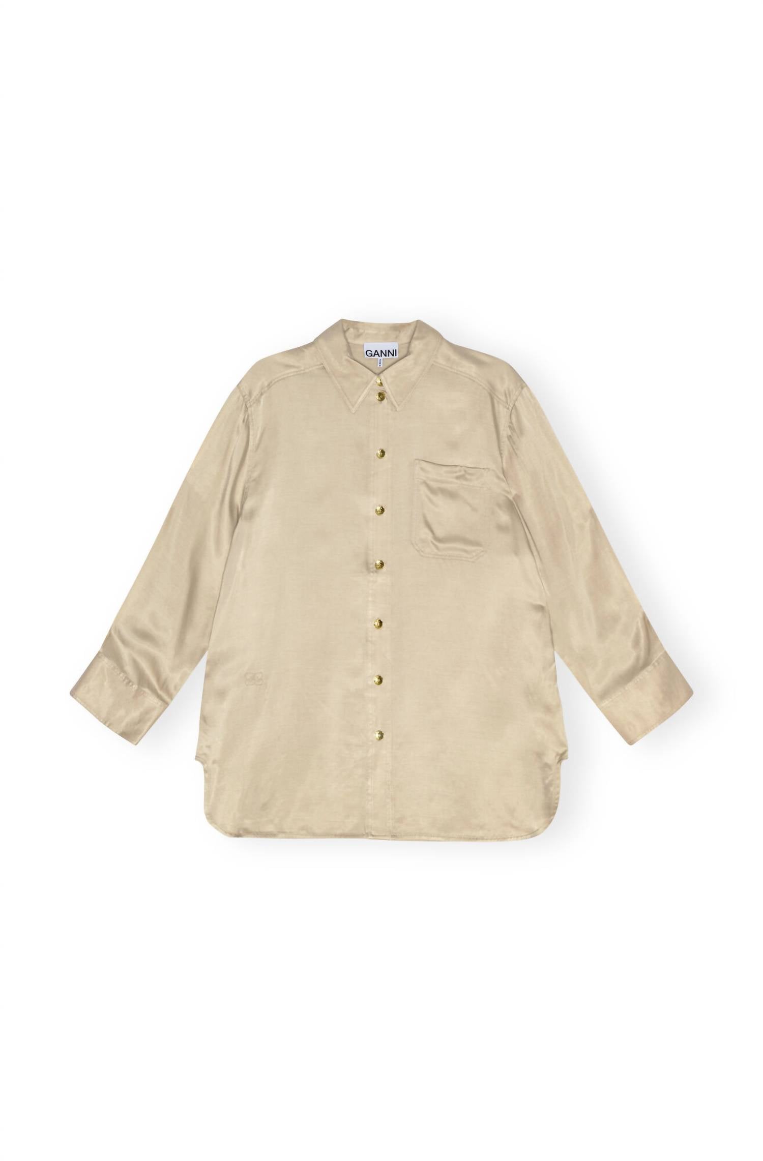 Uma camisa clássica de botões que nunca sai de moda. A Camisa de Cetim Lavado da GANNI é uma adição chique ao seu guarda-roupa, perfeita para um visual minimalista em uma cor sólida Safari. Confeccionada com uma mistura de 50% viscose LENZING ECOVERO e 50% cupro, esta camisa de manga comprida, fabricada na China, apresenta uma gola clássica e um fecho de botão que oferece elegância. Seu caimento oversized, complementado por um bolso frontal e punhos abotoados, resulta em um look estiloso e sem esforço. As instruções de cuidado incluem lavagem à máquina em água fria, evitando alvejantes, secagem em tambor e lavagem a seco, com ferro em baixa temperatura para manutenção.