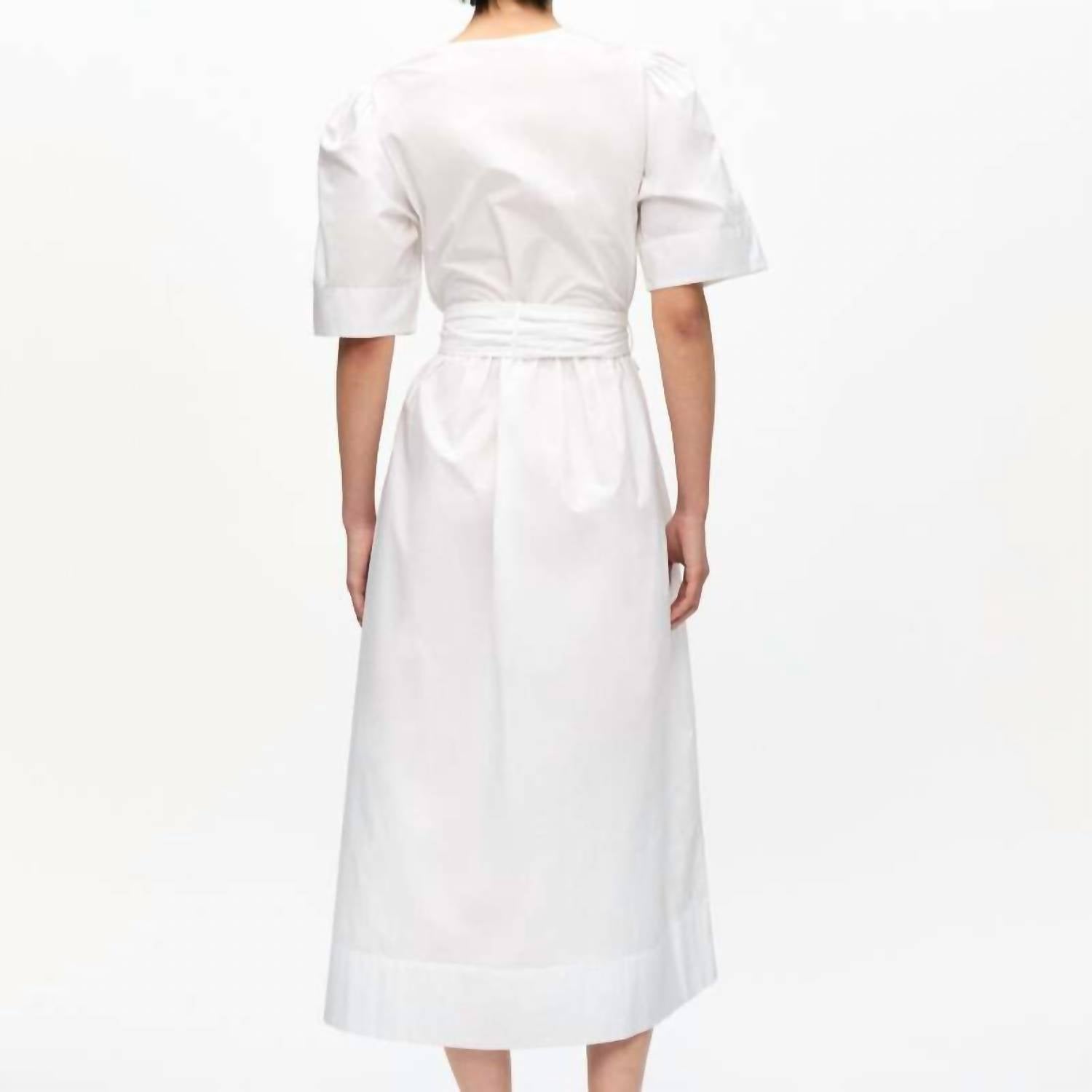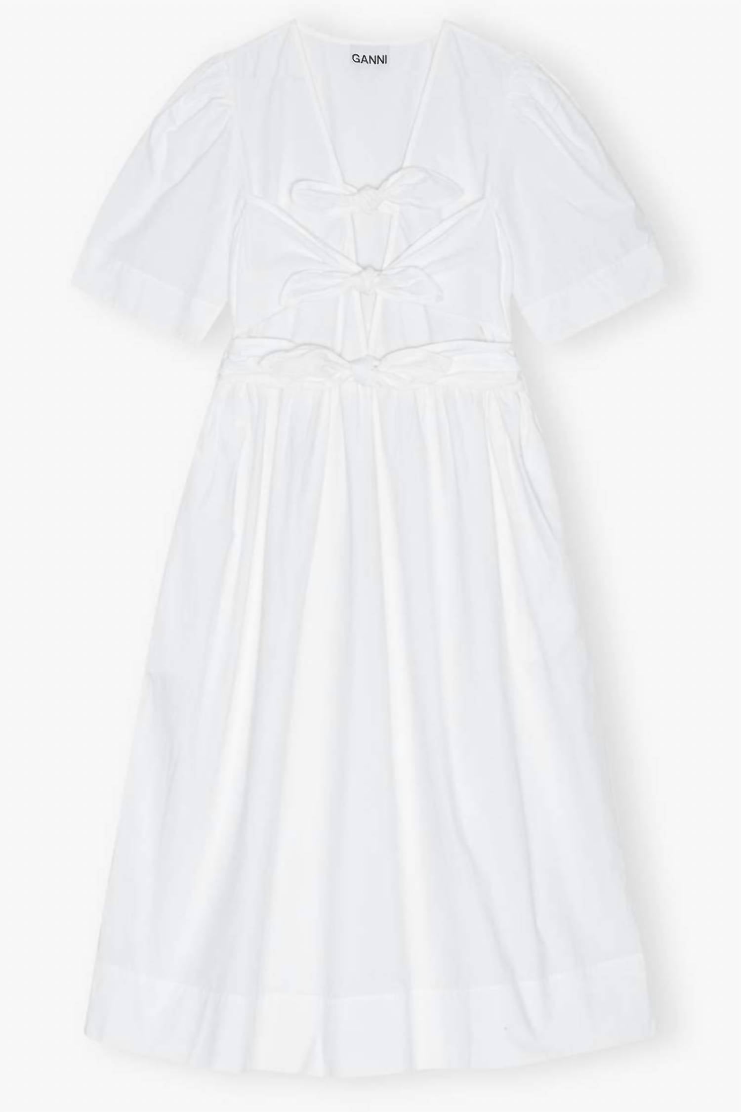 O vestido com o comprimento perfeito existe. O Vestido Midi Ganni Washed Stretch em Branco Brilhante é a combinação perfeita de conforto e estilo para o seu guarda-roupa de verão. Este vestido midi feminino possui mangas curtas bufantes e é confeccionado em uma mistura de 97% algodão e 3% elastano, garantindo um caimento confortável e estruturado. Possui decote em V profundo com três faixas de amarração na frente e bolsos laterais práticos. Com fecho de amarração, este vestido evasê inclui passantes para cinto e saia rodada para uma silhueta sofisticada. O cuidado é fácil com as instruções de lavagem à máquina com água fria, mas evite alvejantes e secagem em tambor.