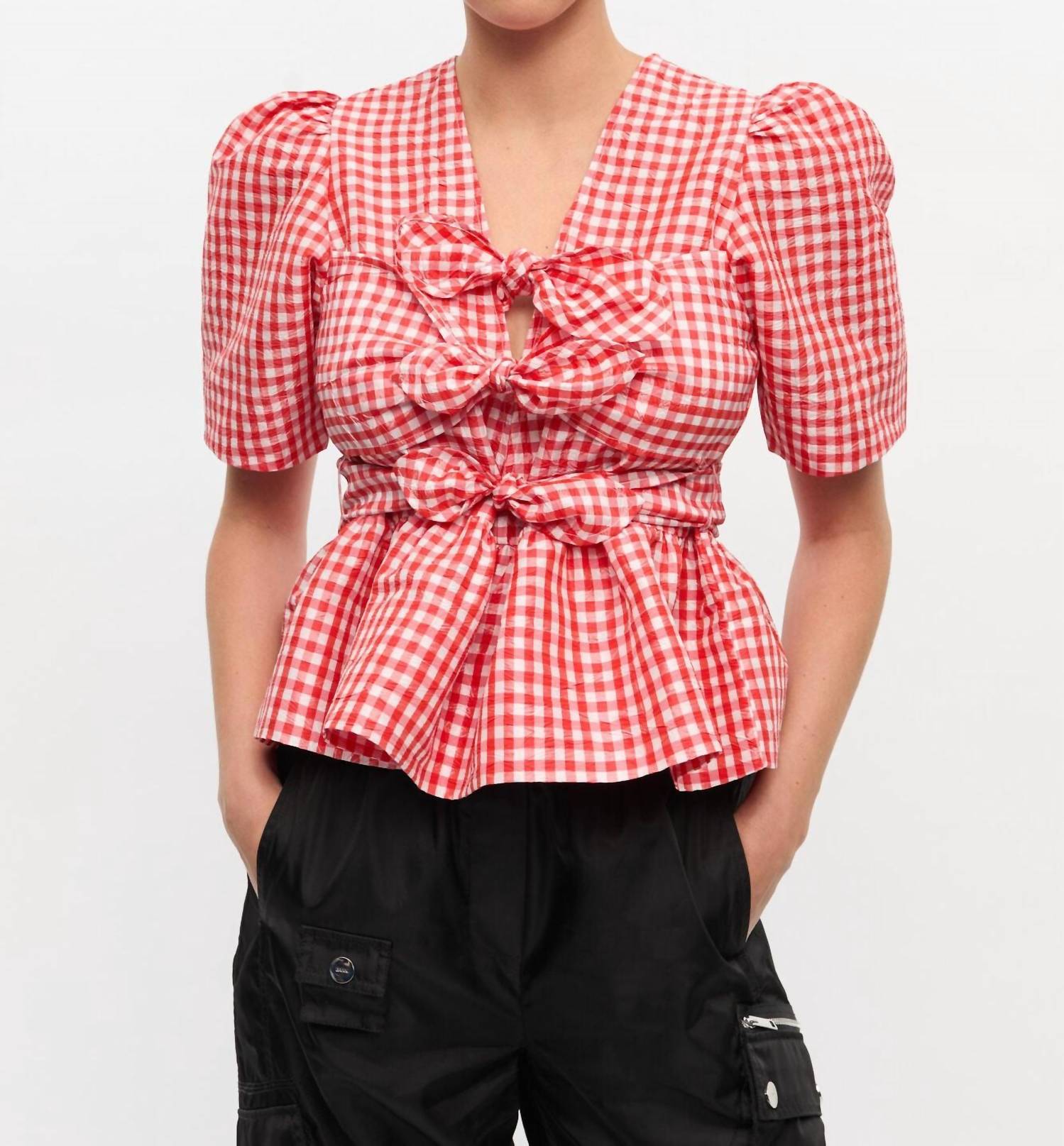 Pair this with your favorite jeans and slides for your next girls night out. Elevate your summer wardrobe with the Women's Crinkled Taffeta Check Tie Strap Blouse by GANNI, a boho-chic staple perfect for vacation. This piece features short sleeves and a captivating V-neckline crafted from a unique gingham pattern in striking Red Alert. Made from 100% recycled polyester with a 100% cotton lining, it's lightweight yet stylish. The tie closure at the straps adds a playful touch, ensuring a flattering fit tailored for warm days.