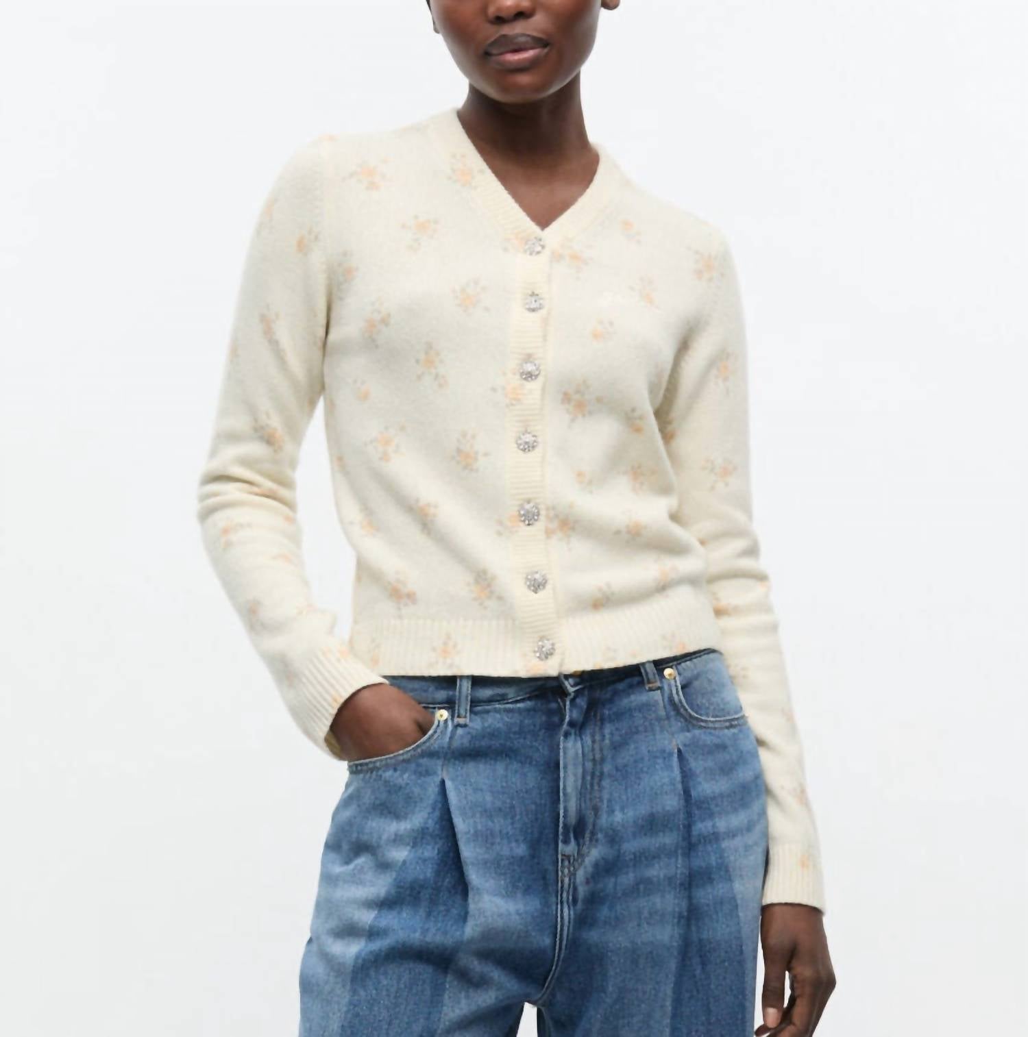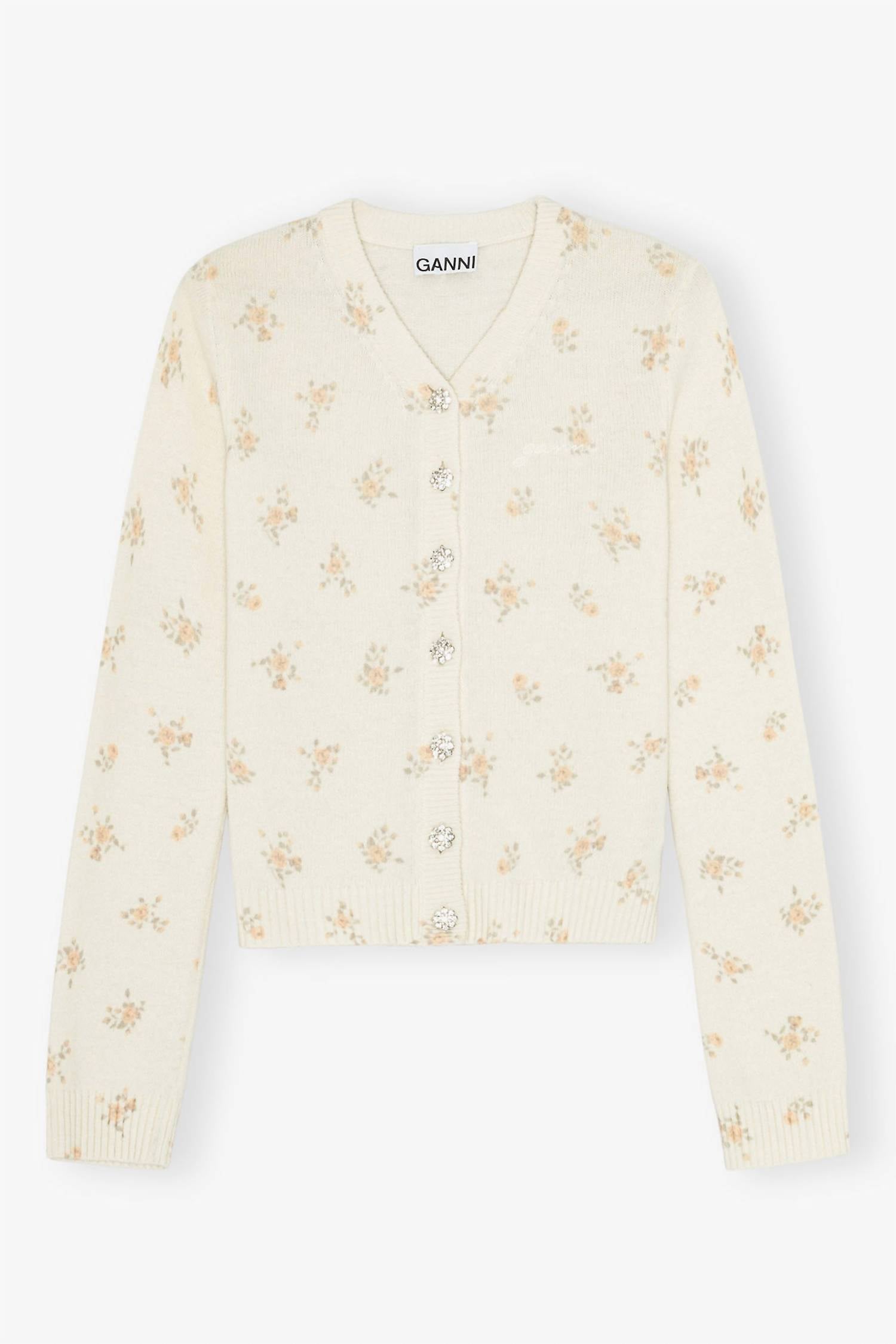 A classic fit that works just as good buttoned as it does left open. Embrace the Boho Chic trend with the Women's Printed Mix Cardigan by GANNI, crafted in a luxurious wool blend. This antique white cardigan features long sleeves and a stylish V-neckline, enhanced by its unique patterned design. The garment is constructed with a composition of 45% wool, 35% recycled wool, and 20% recycled polyamide, emphasizing its sustainable aspect. Each detail, from the ribbed edges to the button closure, is thoughtfully designed for both style and comfort, making it a perfect addition to your fall vacation wardrobe.