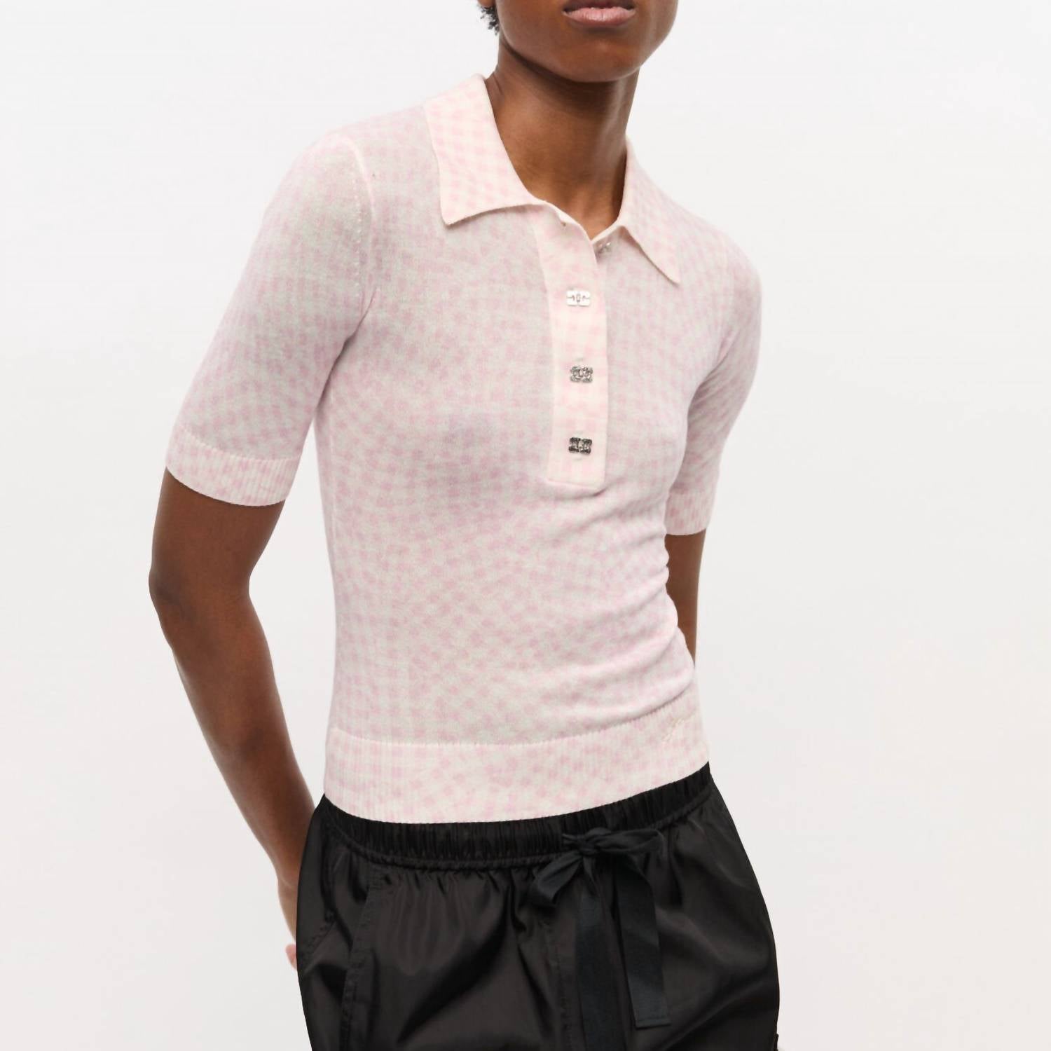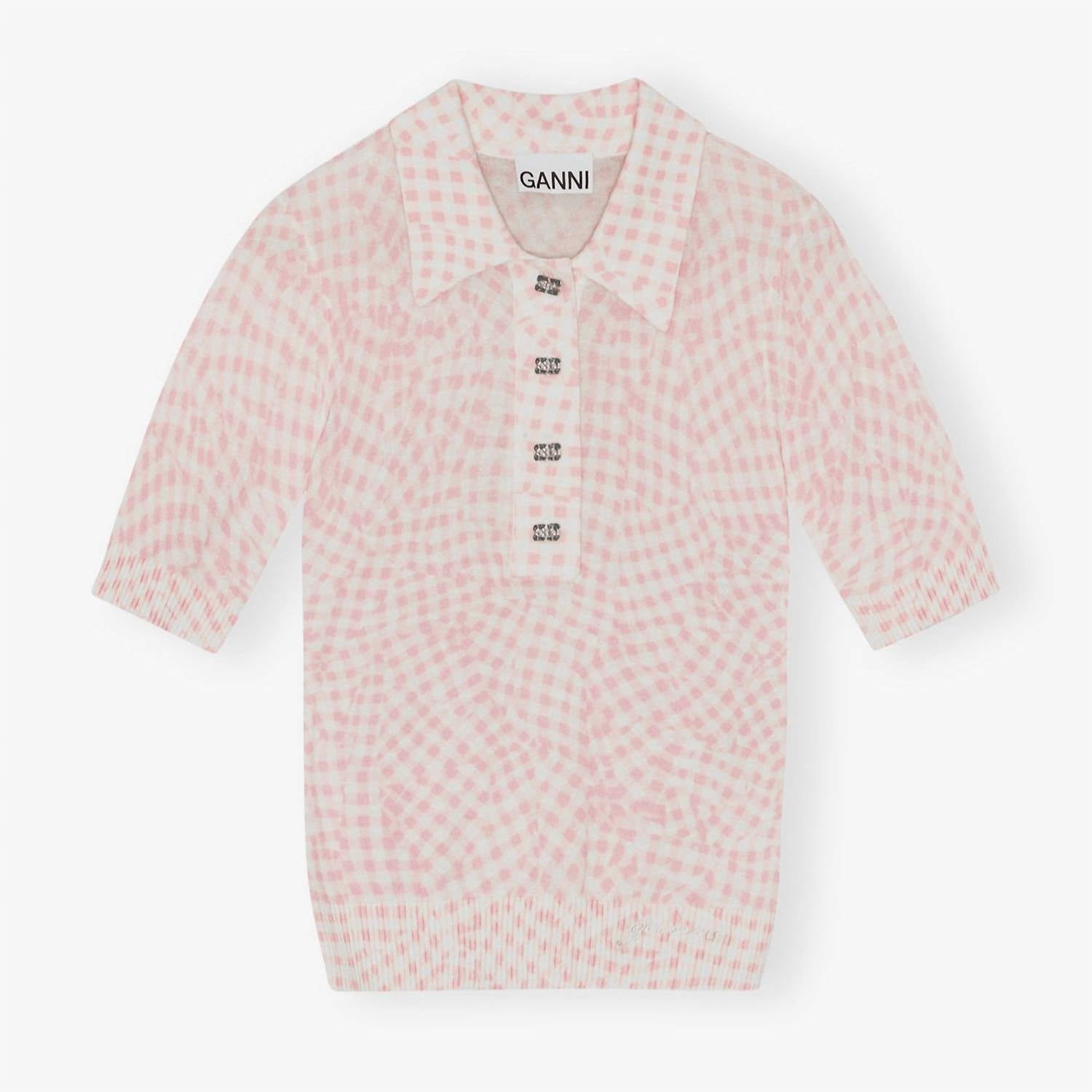 The short sleeve tee you'll want in every color. Introducing the Women's Sheer Printed Polo Top by GANNI, a boho chic addition for your spring wardrobe. This polo showcases short sleeves, a check pattern, and a classic pointed collar accentuated by silver-tone button front closure. Crafted from 91% organic cotton, 8% polyamide, and 1% elastane, it combines comfort with trendiness. Care: Machine wash to maintain its Bleached Mauve hue and textured design.