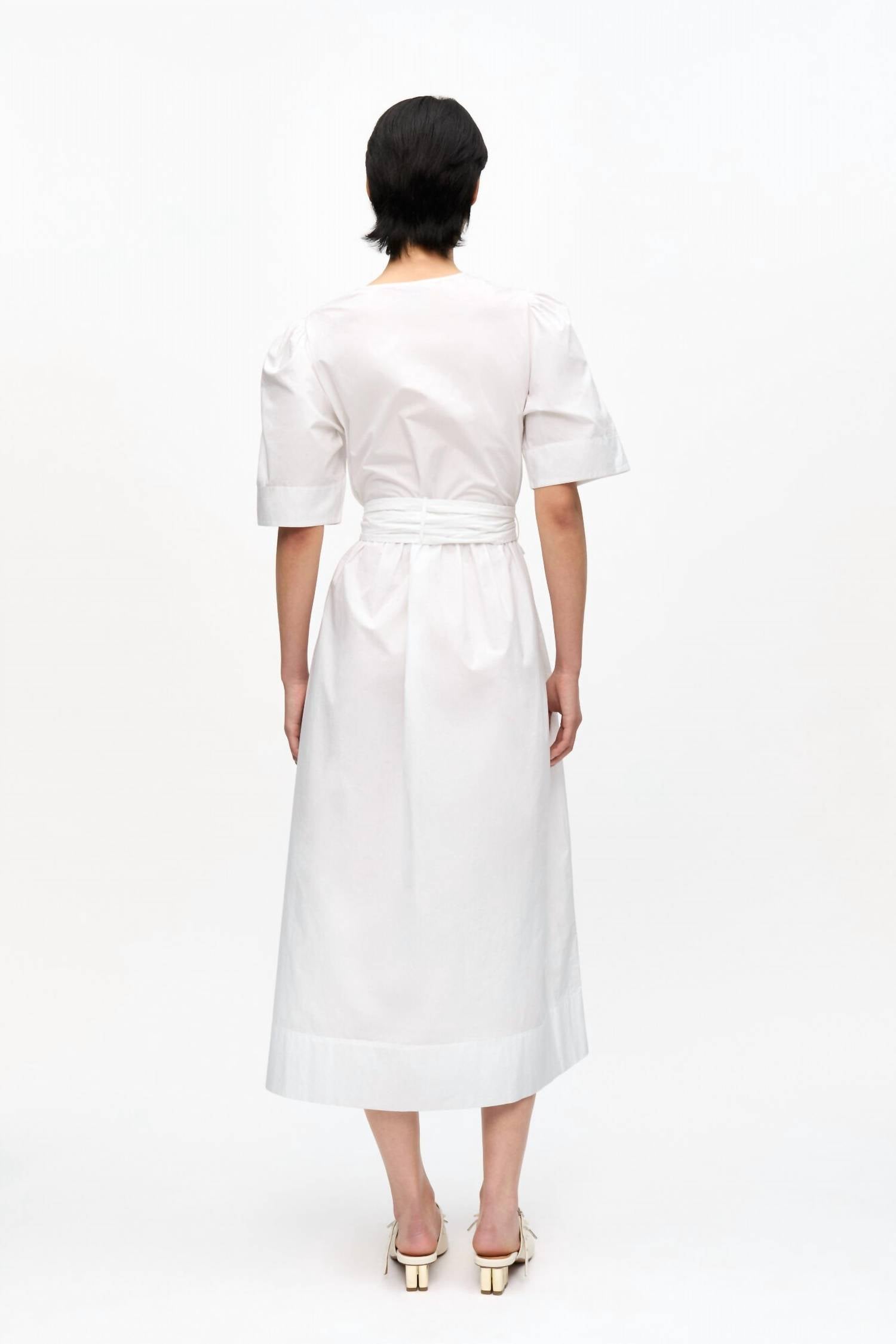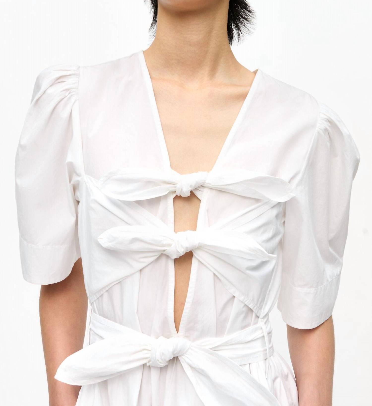 Elevate your vacation wardrobe with the Women's Washed Stretch Cotton Tie Strap Midi Dress by GANNI, crafted in a breathable stretch blend of 97% organic cotton and 3% elastane. This dress boasts short, puffed sleeves, a shift dress silhouette, and a stylish deep V-neckline, complete with three front tie bands and handy side pockets. Designed in a versatile solid white, the flared skirt and belt loops add to its boho chic appeal. Closure: Pull on. Perfect for embracing the summer in style.