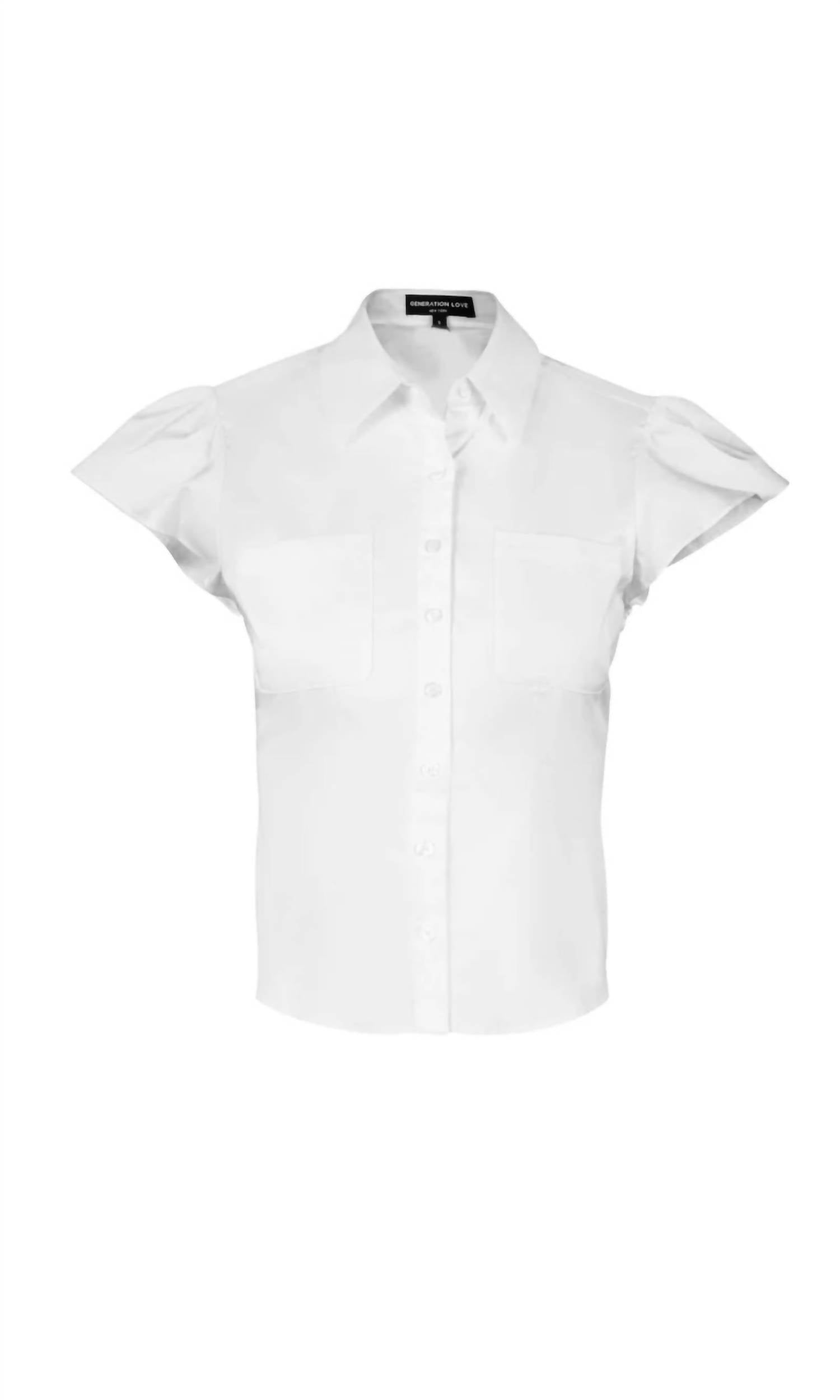 This button down shirt is comfortable yet polished. Discover the Francesca Poplin Shirt by Generation Love, a sophisticated piece crafted in a cotton blend that effortlessly marries classic and modern styles. With its short flutter sleeves and a slim-fit silhouette, this shirt is an ideal choice for a stylish spring look. Composition: 94% Cotton, 6% Elastane. Closure: Button closure, featuring 4-hole shirt buttons and practical patch pockets. Care instructions: Hand wash cold, hang to dry. Length: 22 1/2". The model wears a US size 2/XS and stands 5'9" tall.