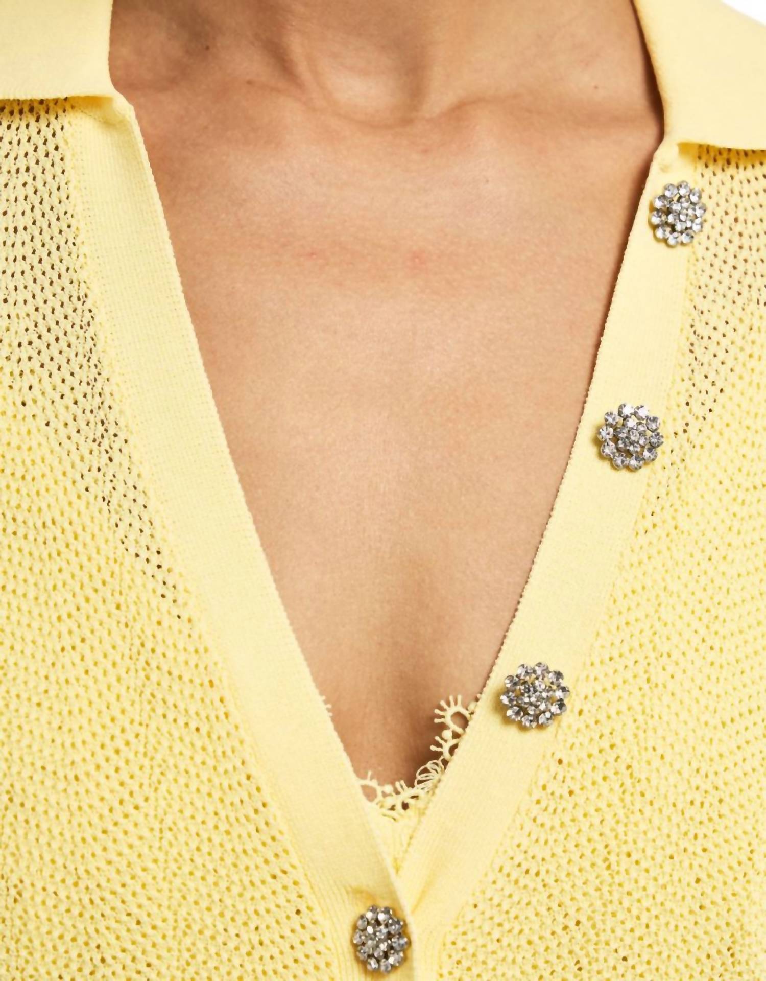 A classic fit that works just as good buttoned as it does left open. Elevate your summer wardrobe with the Megan Pointelle Cardigan by Generation Love, a refined piece in a shimmering pale yellow. This long sleeve cardigan is crafted from a 65% viscose and 35% nylon blend, giving it a textured and stylish appeal. It features a collar neckline and a button closure for a classic look, perfect for a boho chic vibe. Care for this vacation-ready garment with hand washing and laying it flat to dry.