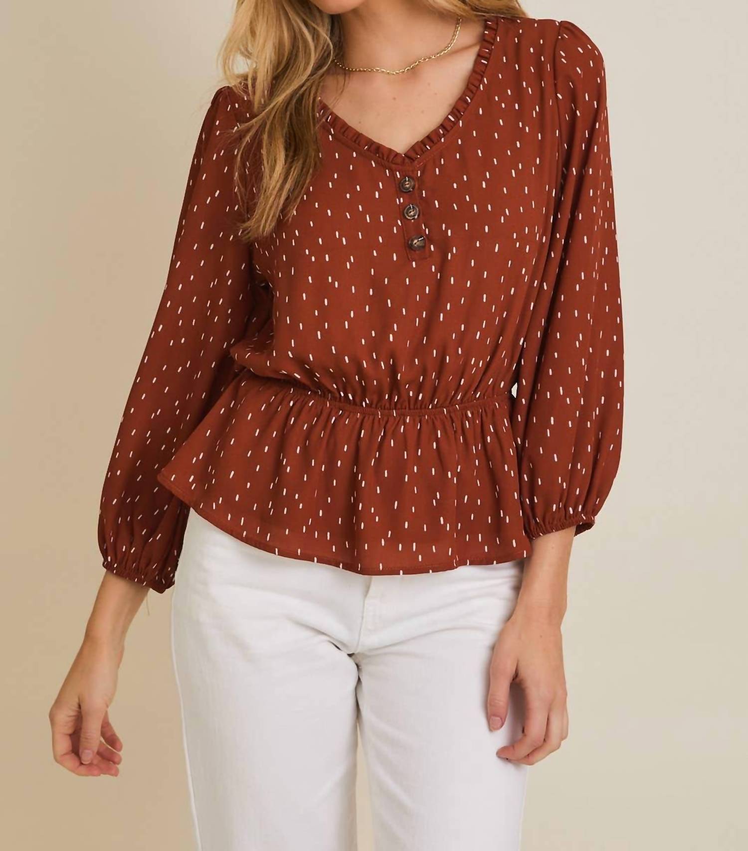 A versatile blouse that works from desk to dinner! Elevate your style with the V-neck Button-up Long Sleeve Shirt by GILLI in a captivating rust-ivory abstract pattern. This long sleeve top, featuring a charming flare hem, guarantees both comfort and style, making it ideal for a relaxed yet trendy look. Closure Type: Pull On. Care: Machine wash. Model is wearing a size small (5'10" height, 32" bust, 25" waist, 35" hip). Perfect for occasions like a baby shower or Easter, this minimalist piece is a spring staple.